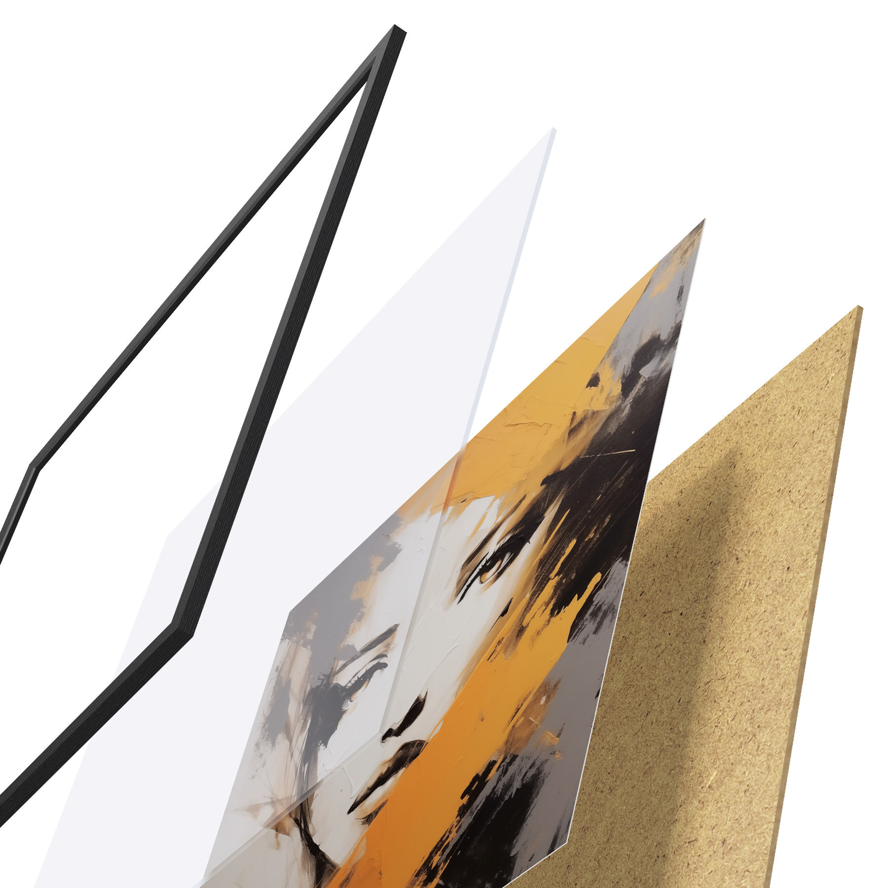 Plagát sa skladá z rámu, plexiskla, vytlačeného obrazu a podkladu z drevotriesky. Plagát možno okamžite zavesiť na stenu vďaka úchytom na zadnej strane.