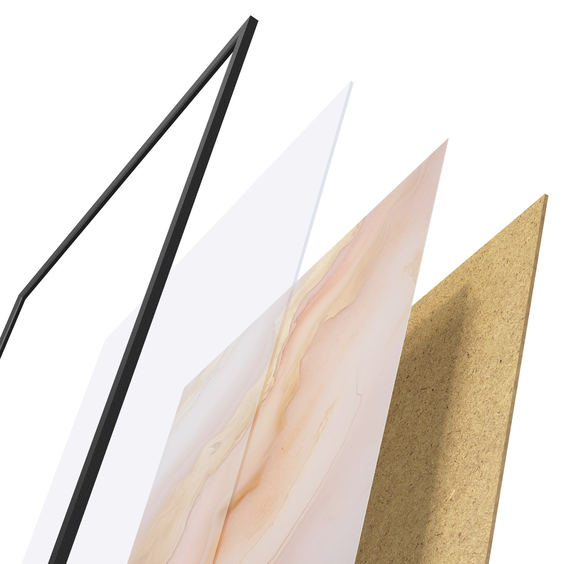 Plagát sa skladá z rámu, plexiskla, vytlačeného obrazu a podkladu z drevotriesky. Plagát možno okamžite zavesiť na stenu vďaka úchytom na zadnej strane.
