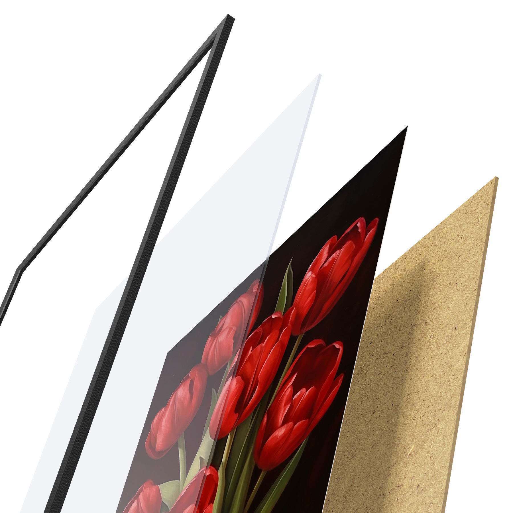 Plagát sa skladá z rámu, plexiskla, vytlačeného obrazu a podkladu z drevotriesky. Plagát možno okamžite zavesiť na stenu vďaka úchytom na zadnej strane.