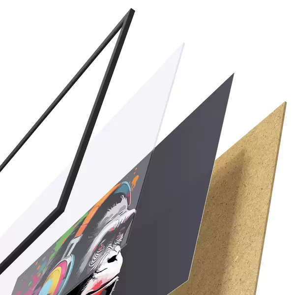 Plagát sa skladá z rámu, plexiskla, vytlačeného obrazu a podkladu z drevotriesky. Plagát možno okamžite zavesiť na stenu vďaka úchytom na zadnej strane.