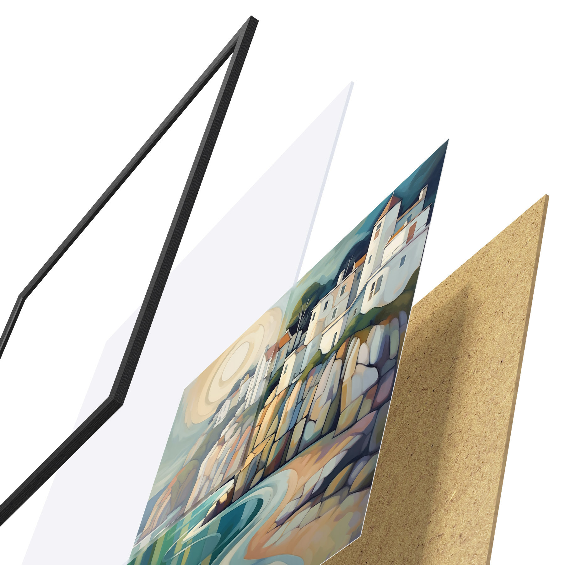 Plagát sa skladá z rámu, plexiskla, vytlačeného obrazu a podkladu z drevotriesky. Plagát možno okamžite zavesiť na stenu vďaka úchytom na zadnej strane.