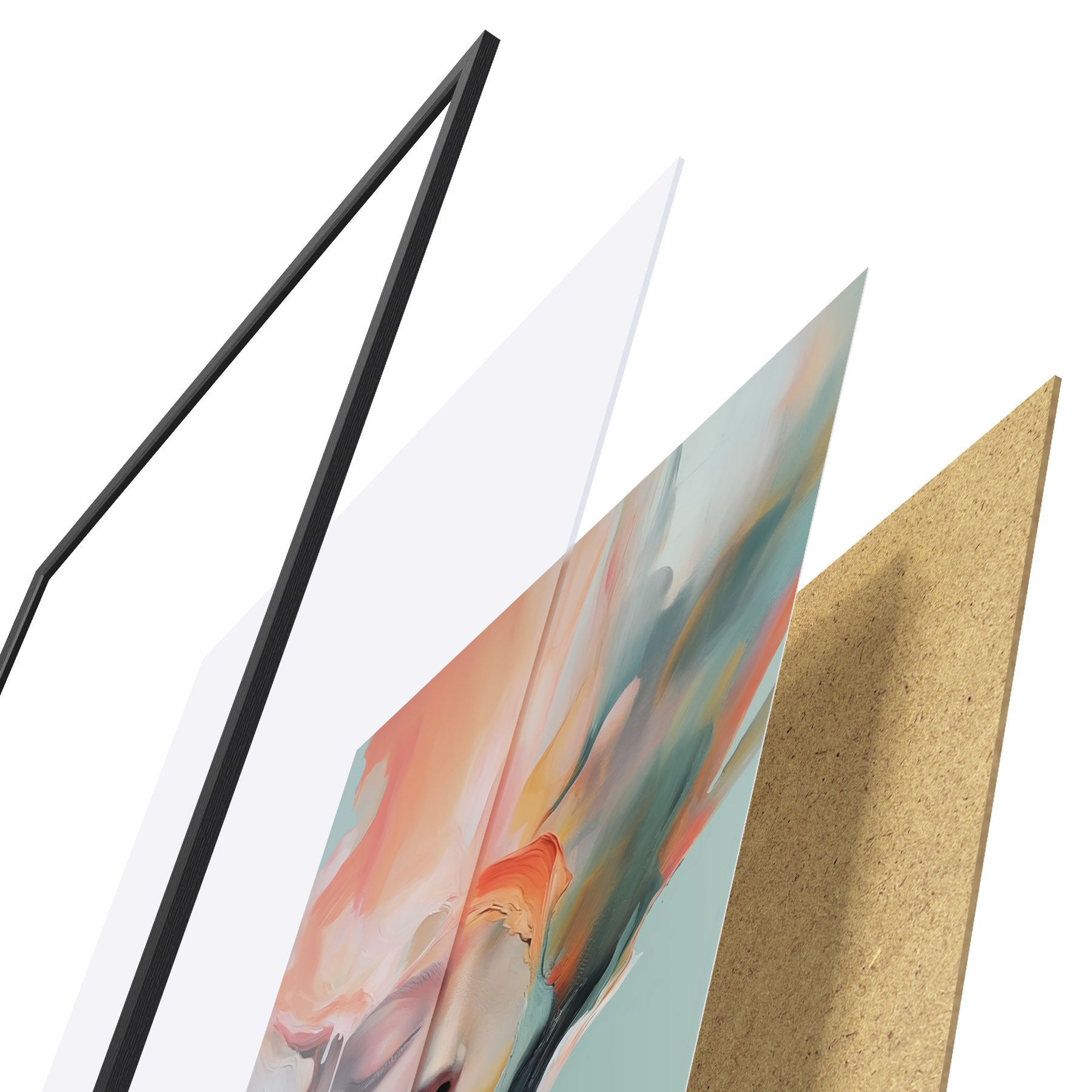 Plagát sa skladá z rámu, plexiskla, vytlačeného obrazu a podkladu z drevotriesky. Plagát možno okamžite zavesiť na stenu vďaka úchytom na zadnej strane.