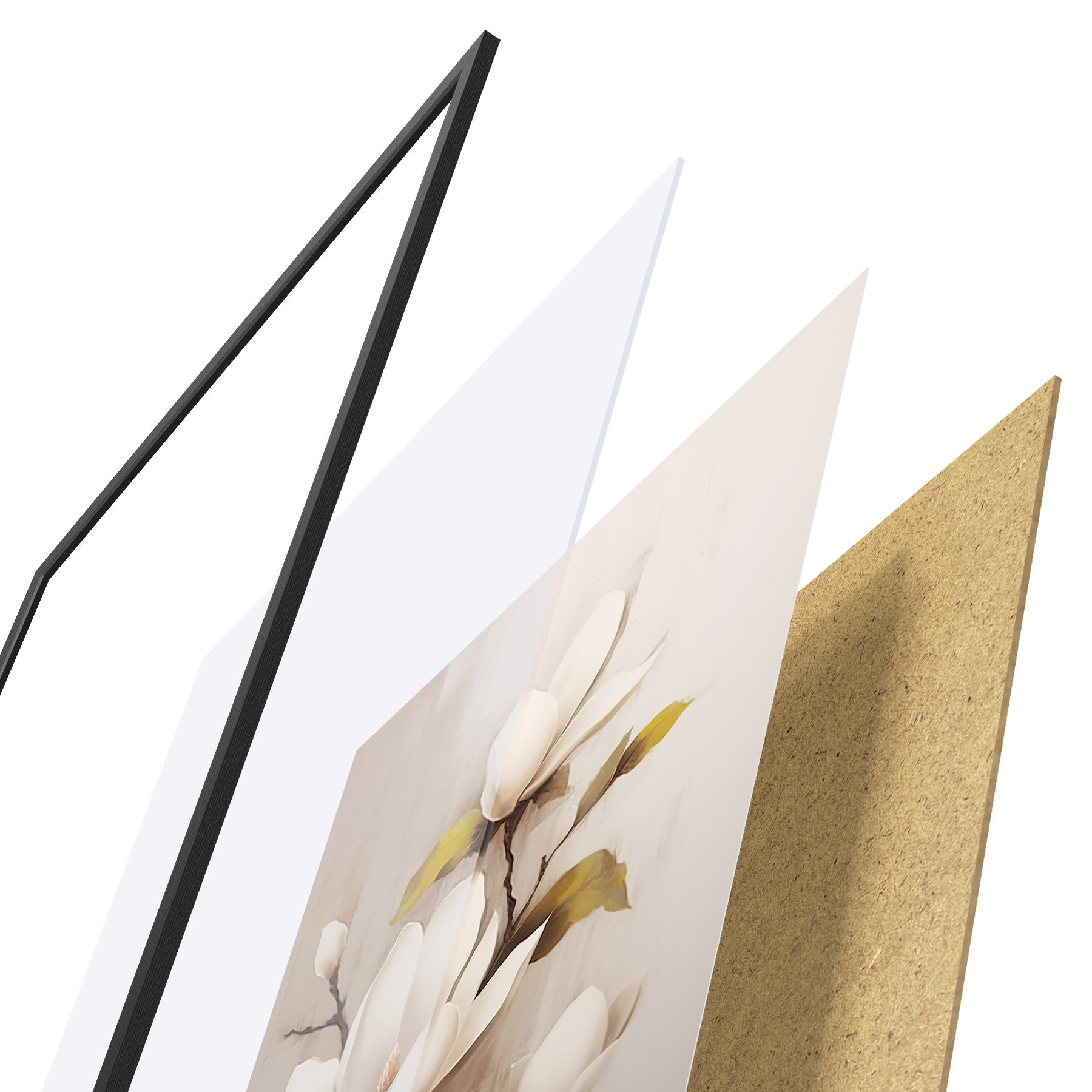 Plagát sa skladá z rámu, plexiskla, vytlačeného obrazu a podkladu z drevotriesky. Plagát možno okamžite zavesiť na stenu vďaka úchytom na zadnej strane.