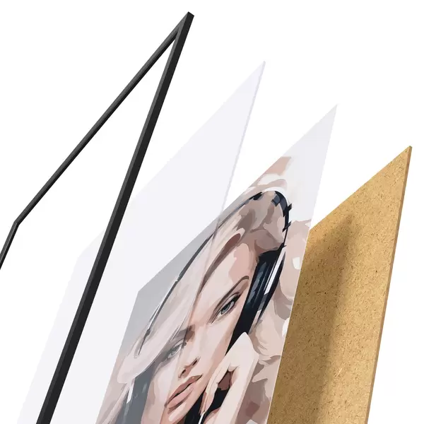 Plagát sa skladá z rámu, plexiskla, vytlačeného obrazu a podkladu z drevotriesky. Plagát možno okamžite zavesiť na stenu vďaka úchytom na zadnej strane.