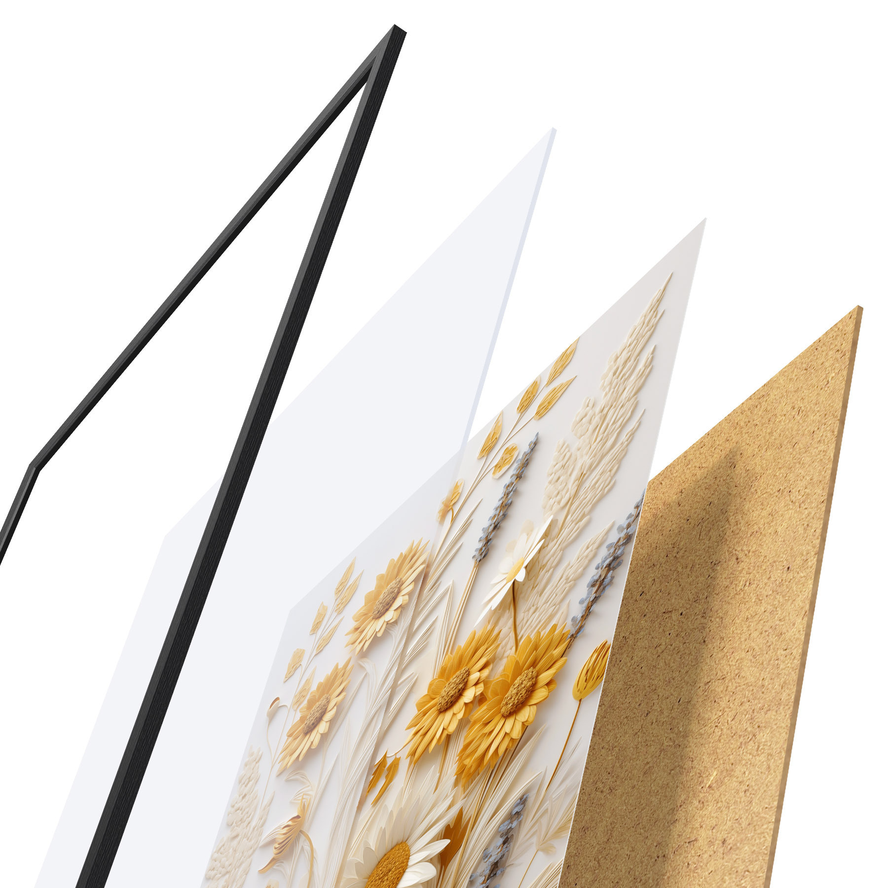 Plagát sa skladá z rámu, plexiskla, vytlačeného obrazu a podkladu z drevotriesky. Plagát možno okamžite zavesiť na stenu vďaka úchytom na zadnej strane.