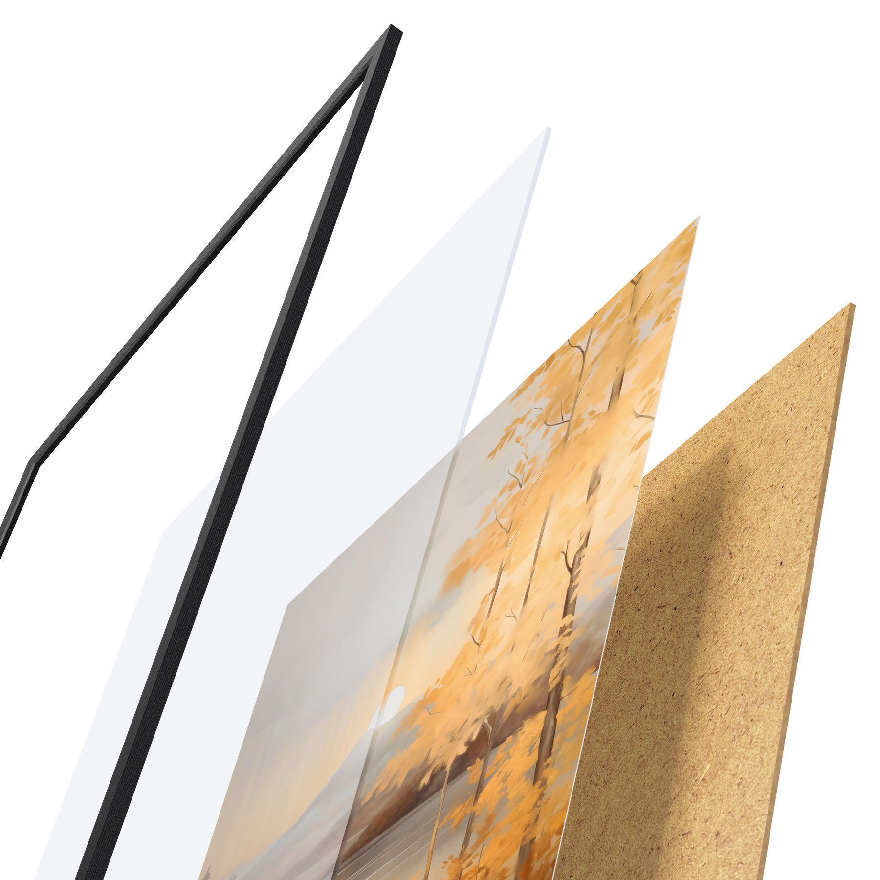 Plagát sa skladá z rámu, plexiskla, vytlačeného obrazu a podkladu z drevotriesky. Plagát možno okamžite zavesiť na stenu vďaka úchytom na zadnej strane.