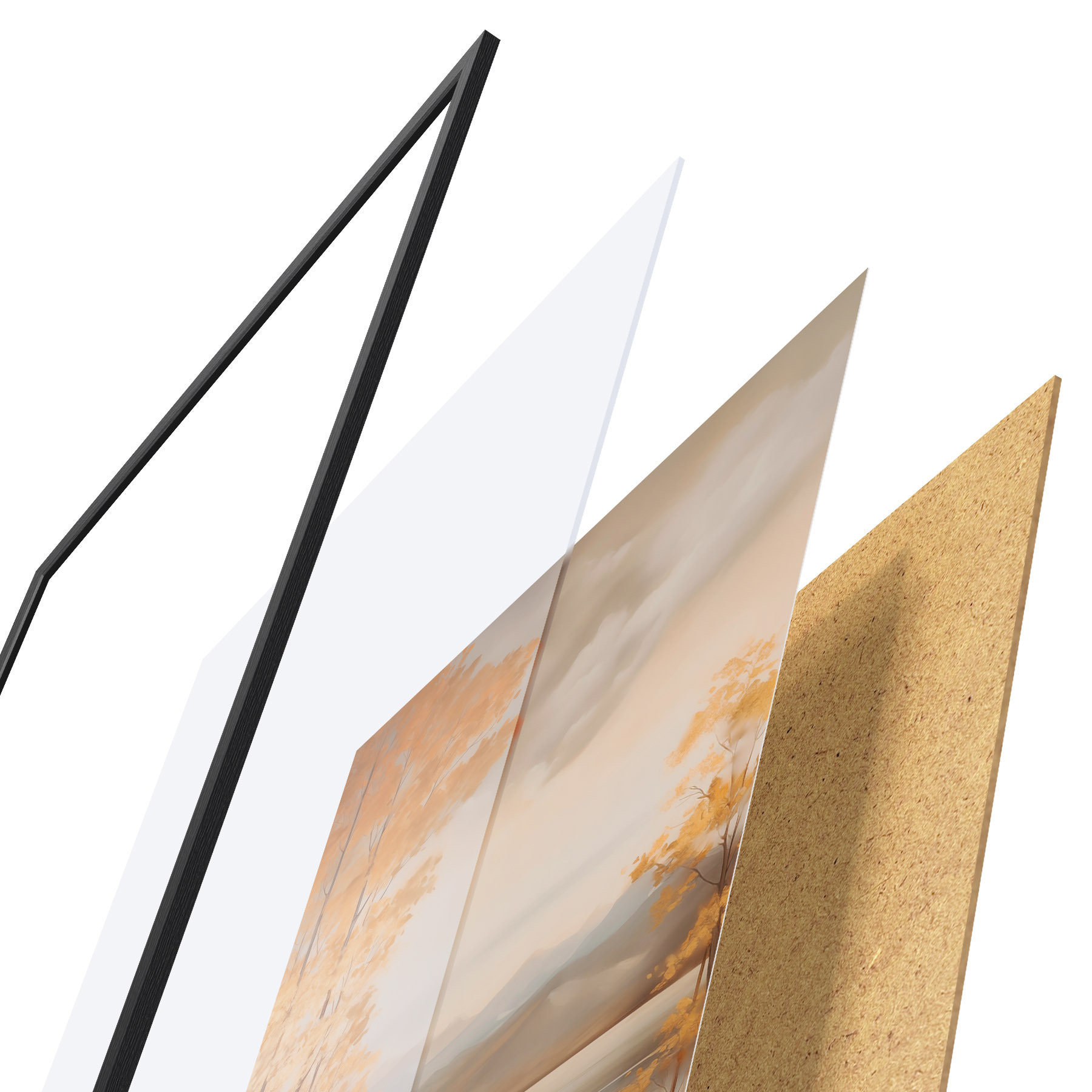 Plagát sa skladá z rámu, plexiskla, vytlačeného obrazu a podkladu z drevotriesky. Plagát možno okamžite zavesiť na stenu vďaka úchytom na zadnej strane.