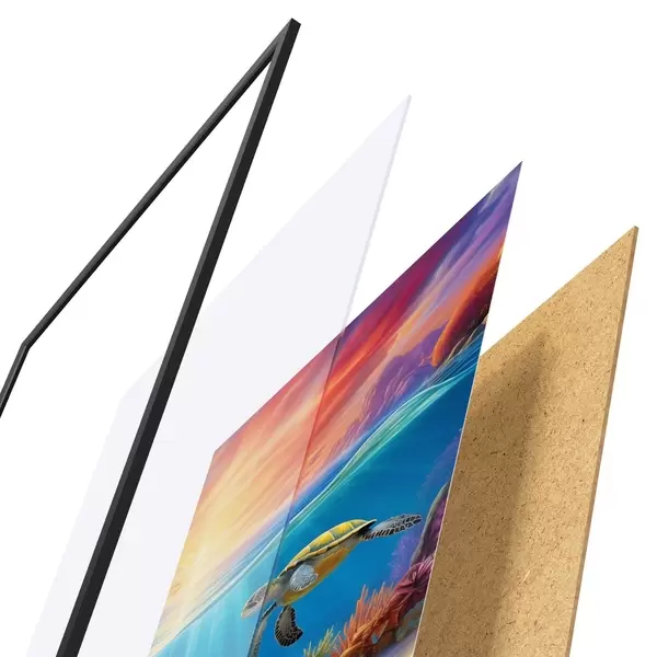 Plagát sa skladá z rámu, plexiskla, vytlačeného obrazu a podkladu z drevotriesky. Plagát možno okamžite zavesiť na stenu vďaka úchytom na zadnej strane.