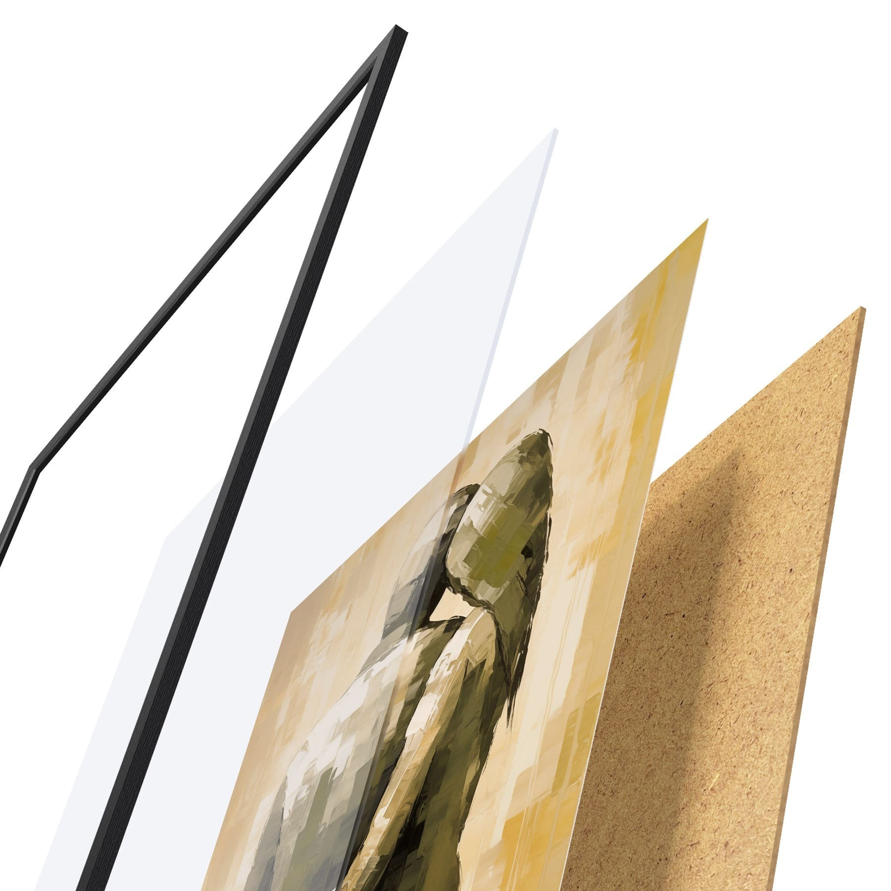 Plagát sa skladá z rámu, plexiskla, vytlačeného obrazu a podkladu z drevotriesky. Plagát možno okamžite zavesiť na stenu vďaka úchytom na zadnej strane.
