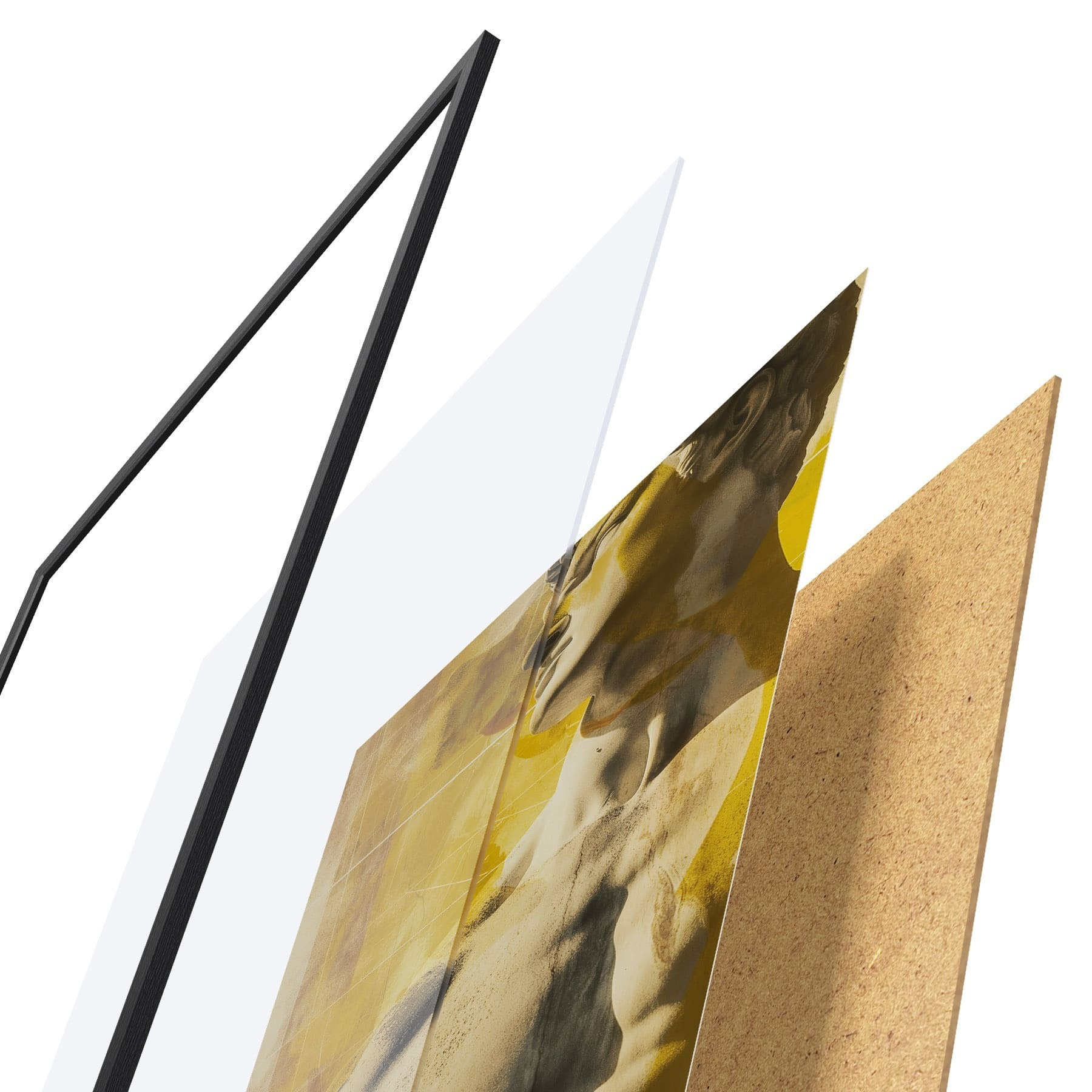 Plagát sa skladá z rámu, plexiskla, vytlačeného obrazu a podkladu z drevotriesky. Plagát možno okamžite zavesiť na stenu vďaka úchytom na zadnej strane.