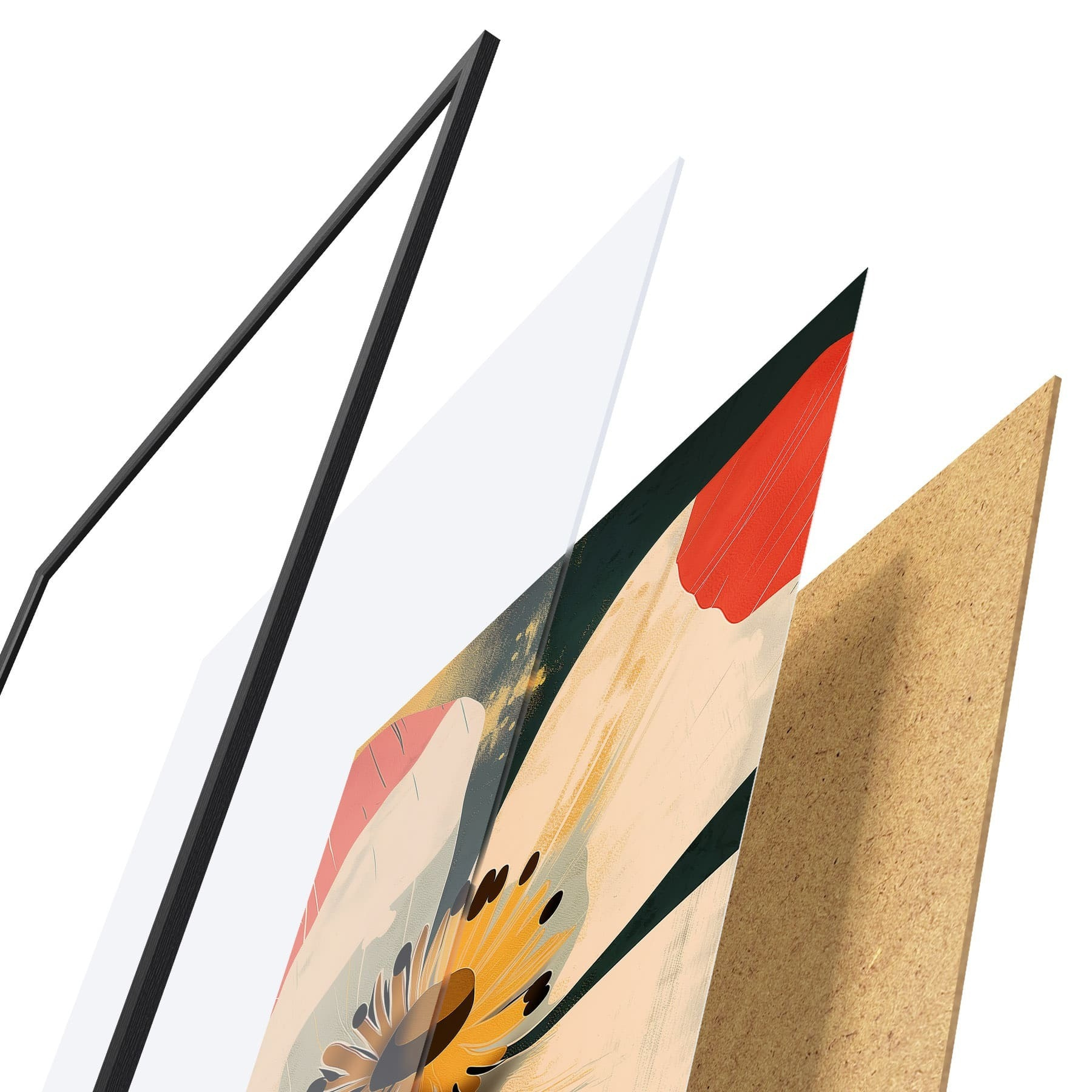 Plagát sa skladá z rámu, plexiskla, vytlačeného obrazu a podkladu z drevotriesky. Plagát možno okamžite zavesiť na stenu vďaka úchytom na zadnej strane.