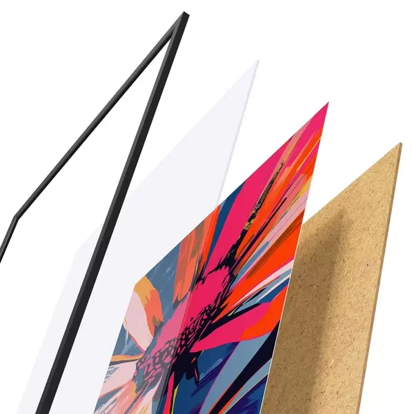 Plagát sa skladá z rámu, plexiskla, vytlačeného obrazu a podkladu z drevotriesky. Plagát možno okamžite zavesiť na stenu vďaka úchytom na zadnej strane.