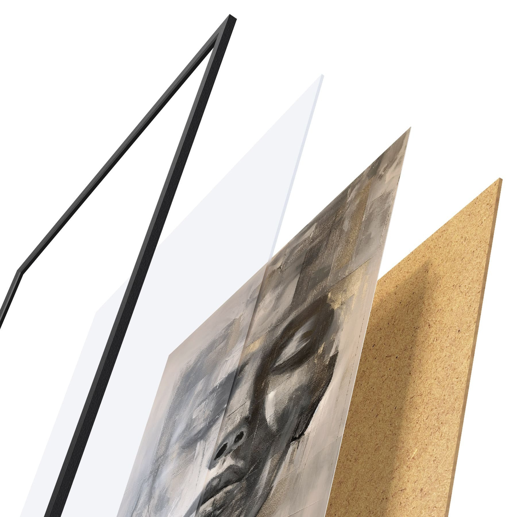Plagát sa skladá z rámu, plexiskla, vytlačeného obrazu a podkladu z drevotriesky. Plagát možno okamžite zavesiť na stenu vďaka úchytom na zadnej strane.
