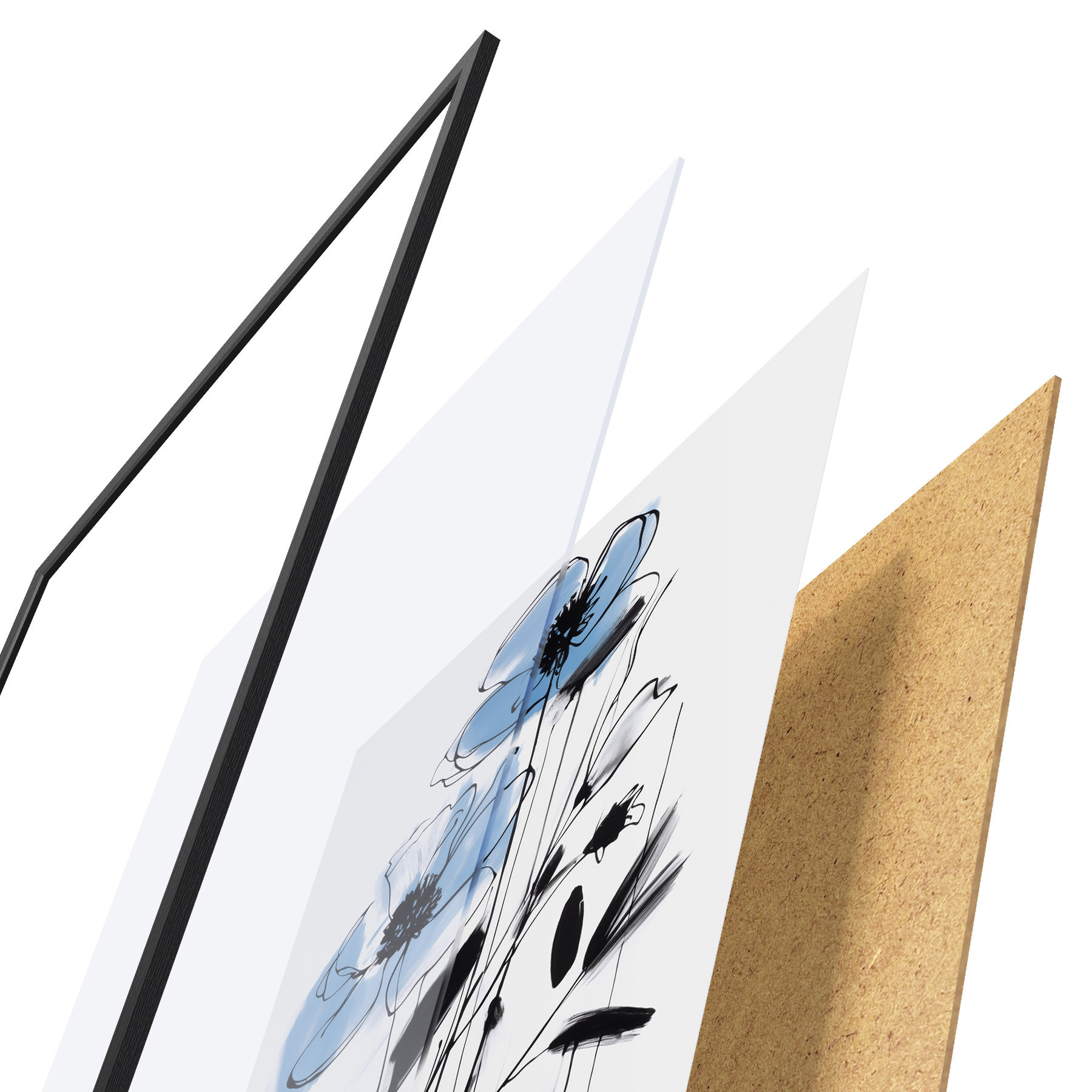 Plagát sa skladá z rámu, plexiskla, vytlačeného obrazu a podkladu z drevotriesky. Plagát možno okamžite zavesiť na stenu vďaka úchytom na zadnej strane.
