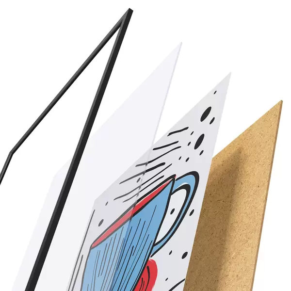 Plagát sa skladá z rámu, plexiskla, vytlačeného obrazu a podkladu z drevotriesky. Plagát možno okamžite zavesiť na stenu vďaka úchytom na zadnej strane.