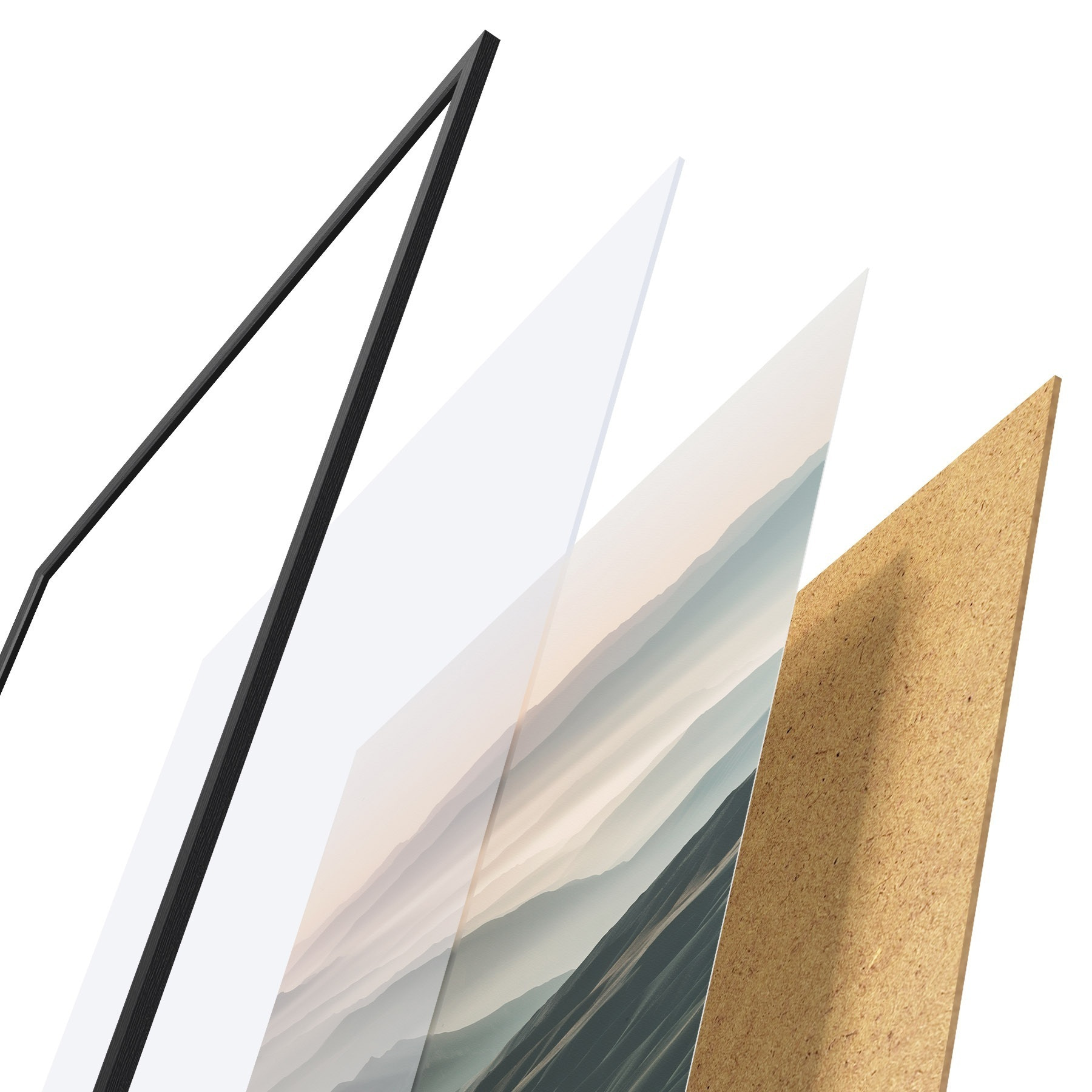 Plagát sa skladá z rámu, plexiskla, vytlačeného obrazu a podkladu z drevotriesky. Plagát možno okamžite zavesiť na stenu vďaka úchytom na zadnej strane.