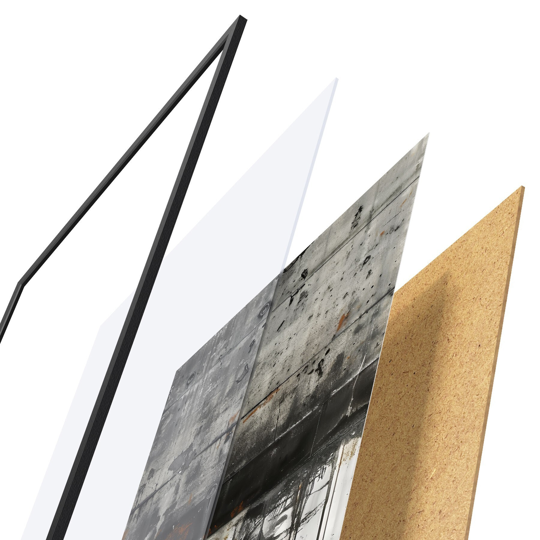 Plagát sa skladá z rámu, plexiskla, vytlačeného obrazu a podkladu z drevotriesky. Plagát možno okamžite zavesiť na stenu vďaka úchytom na zadnej strane.