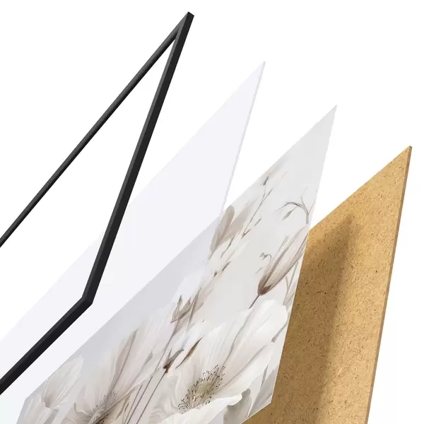 Plagát sa skladá z rámu, plexiskla, vytlačeného obrazu a podkladu z drevotriesky. Plagát možno okamžite zavesiť na stenu vďaka úchytom na zadnej strane.