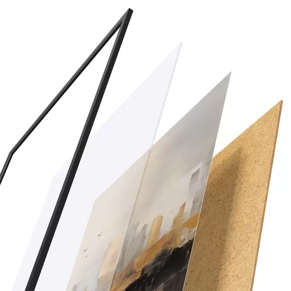 Plagát sa skladá z rámu, plexiskla, vytlačeného obrazu a podkladu z drevotriesky. Plagát možno okamžite zavesiť na stenu vďaka úchytom na zadnej strane.