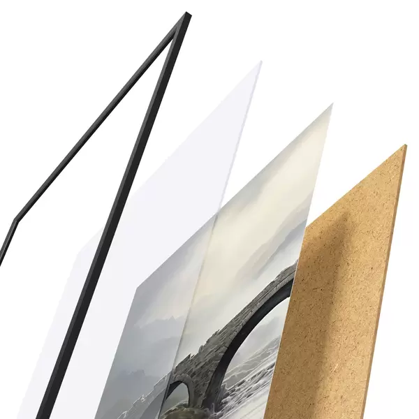 Plagát sa skladá z rámu, plexiskla, vytlačeného obrazu a podkladu z drevotriesky. Plagát možno okamžite zavesiť na stenu vďaka úchytom na zadnej strane.