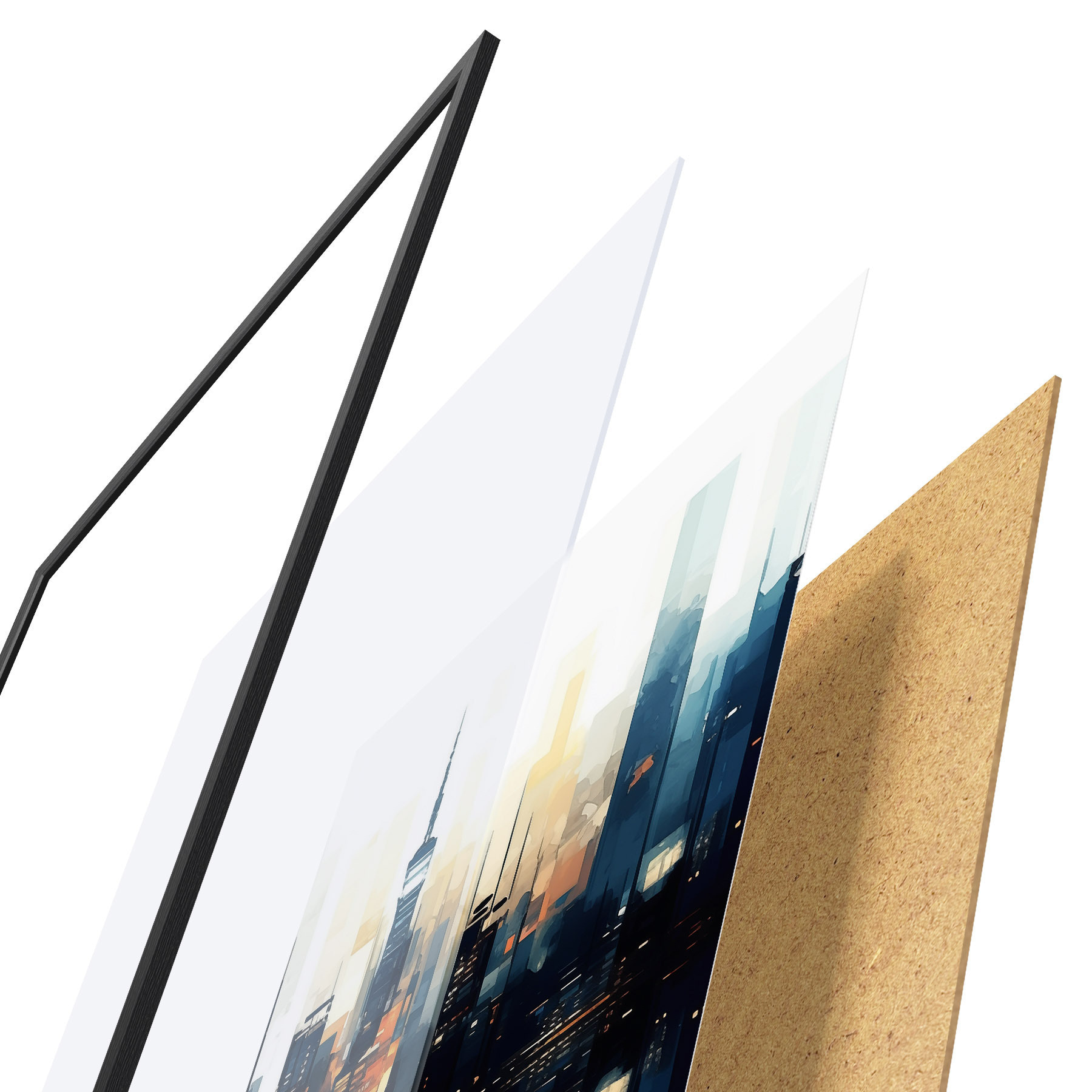 Plagát sa skladá z rámu, plexiskla, vytlačeného obrazu a podkladu z drevotriesky. Plagát možno okamžite zavesiť na stenu vďaka úchytom na zadnej strane.