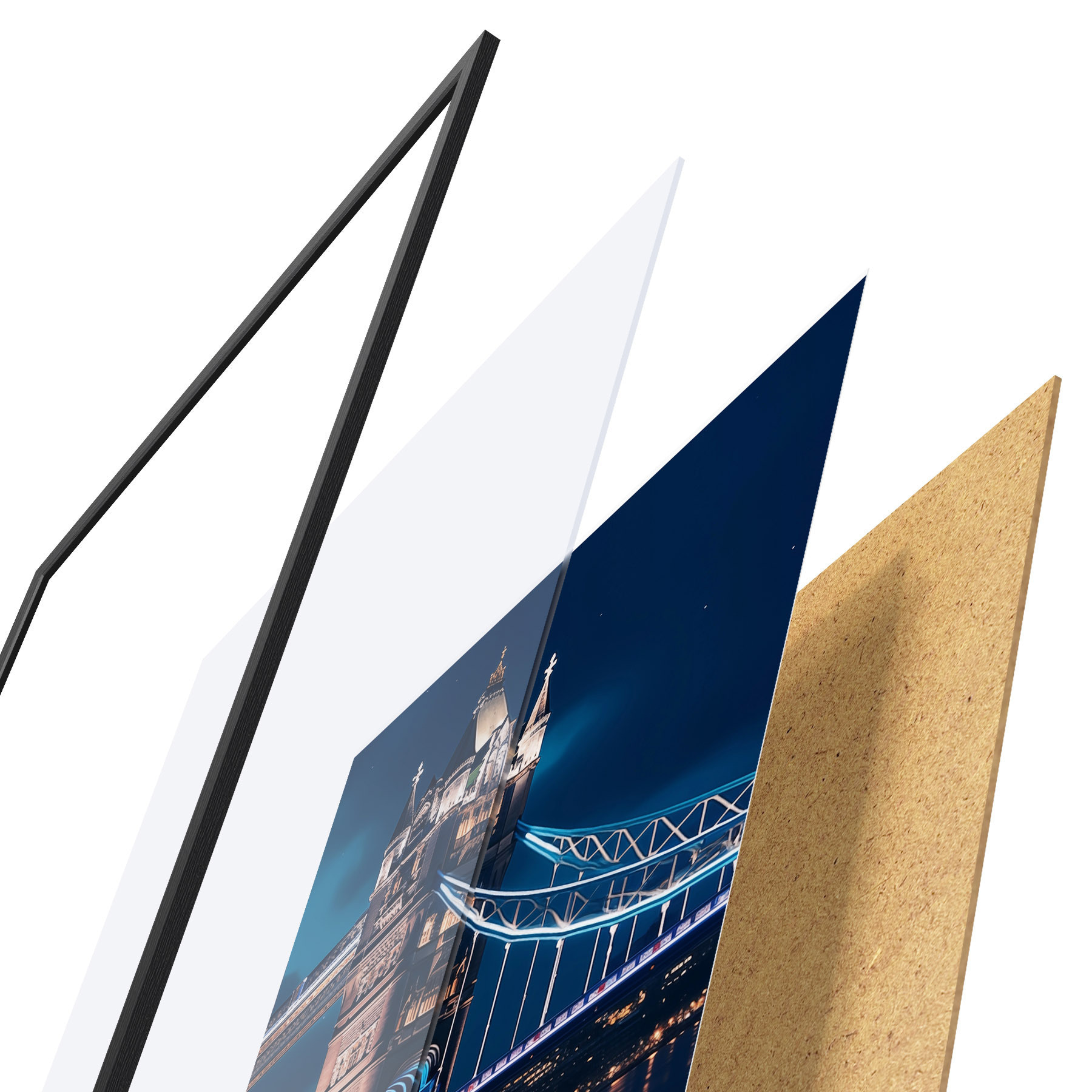 Plagát sa skladá z rámu, plexiskla, vytlačeného obrazu a podkladu z drevotriesky. Plagát možno okamžite zavesiť na stenu vďaka úchytom na zadnej strane.