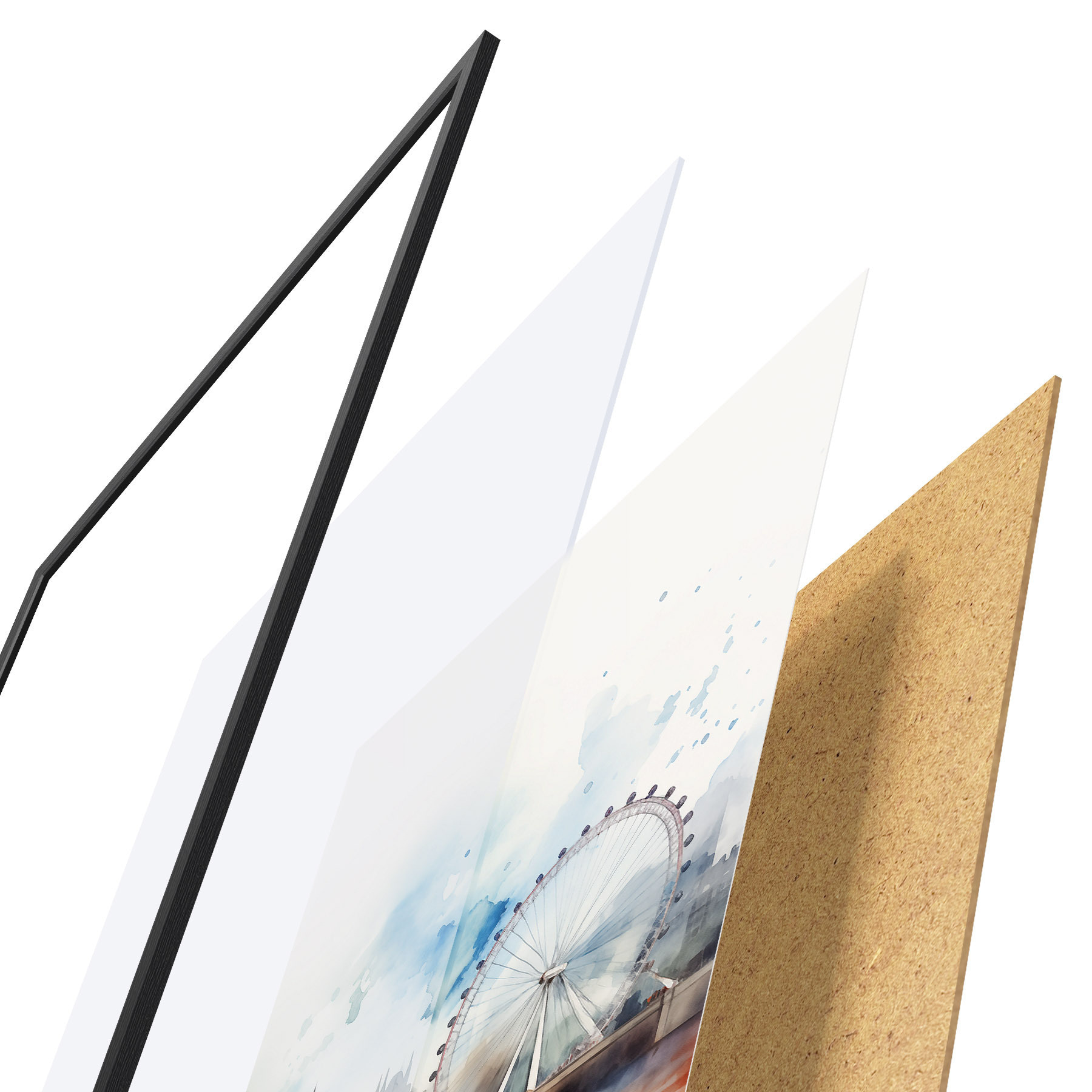 Plagát sa skladá z rámu, plexiskla, vytlačeného obrazu a podkladu z drevotriesky. Plagát možno okamžite zavesiť na stenu vďaka úchytom na zadnej strane.