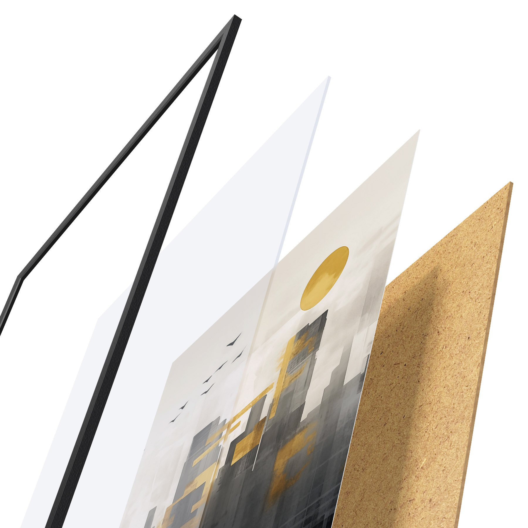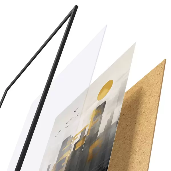 Plagát sa skladá z rámu, plexiskla, vytlačeného obrazu a podkladu z drevotriesky. Plagát možno okamžite zavesiť na stenu vďaka úchytom na zadnej strane.