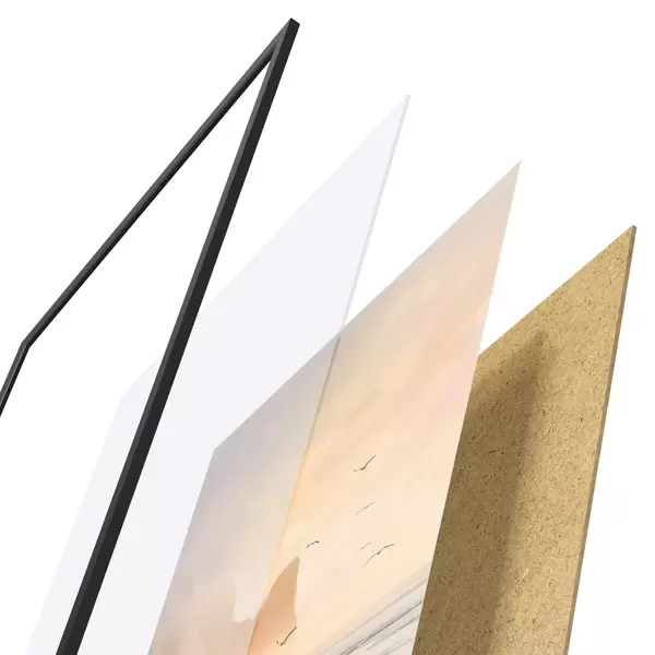Plagát sa skladá z rámu, plexiskla, vytlačeného obrazu a podkladu z drevotriesky. Plagát možno okamžite zavesiť na stenu vďaka úchytom na zadnej strane.