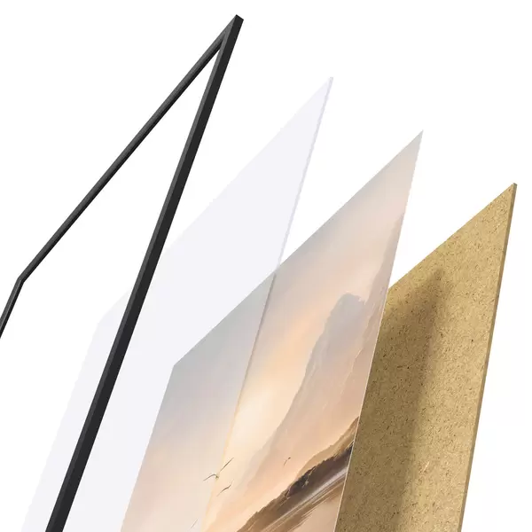 Plagát sa skladá z rámu, plexiskla, vytlačeného obrazu a podkladu z drevotriesky. Plagát možno okamžite zavesiť na stenu vďaka úchytom na zadnej strane.