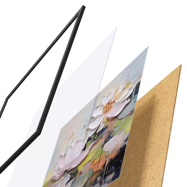 Plagát sa skladá z rámu, plexiskla, vytlačeného obrazu a podkladu z drevotriesky. Plagát možno okamžite zavesiť na stenu vďaka úchytom na zadnej strane.