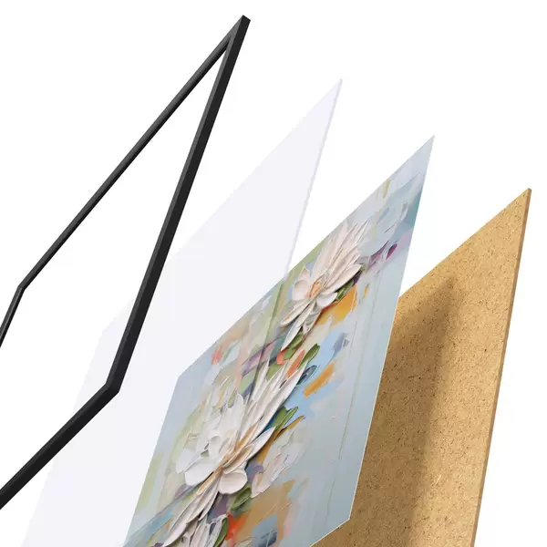 Plagát sa skladá z rámu, plexiskla, vytlačeného obrazu a podkladu z drevotriesky. Plagát možno okamžite zavesiť na stenu vďaka úchytom na zadnej strane.