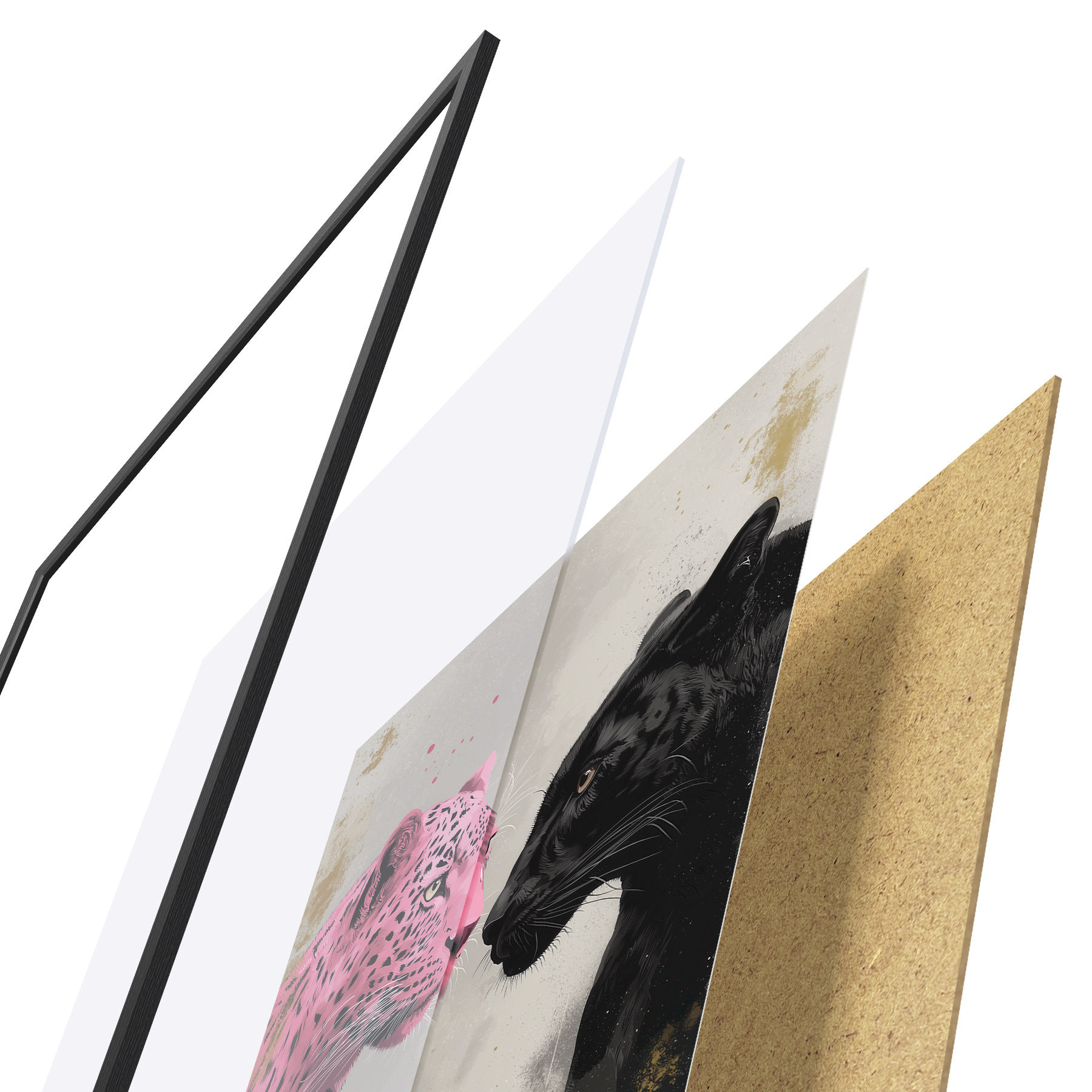 Plagát sa skladá z rámu, plexiskla, vytlačeného obrazu a podkladu z drevotriesky. Plagát možno okamžite zavesiť na stenu vďaka úchytom na zadnej strane.