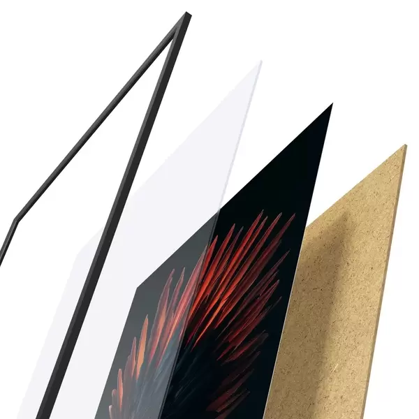 Plagát sa skladá z rámu, plexiskla, vytlačeného obrazu a podkladu z drevotriesky. Plagát možno okamžite zavesiť na stenu vďaka úchytom na zadnej strane.