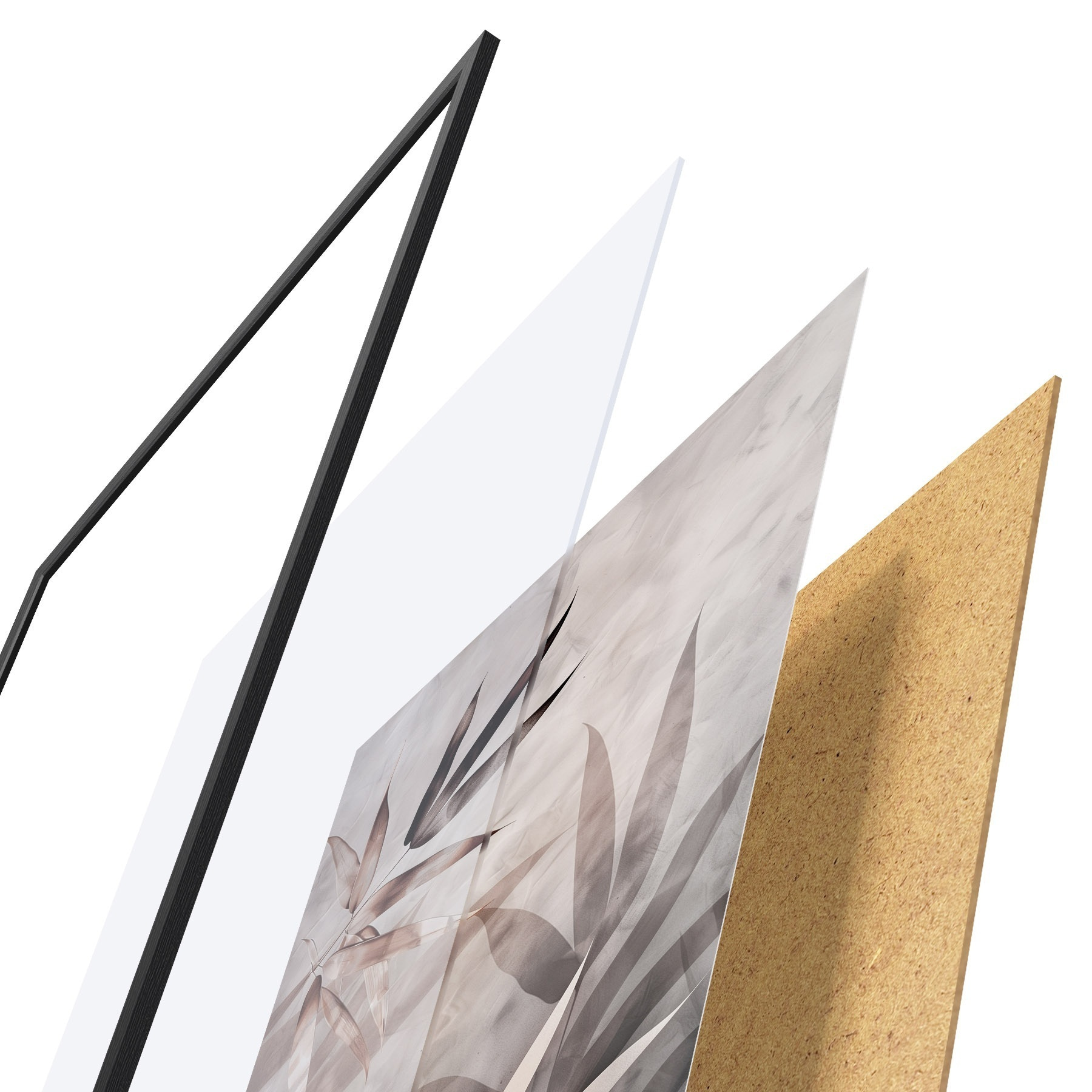Plagát sa skladá z rámu, plexiskla, vytlačeného obrazu a podkladu z drevotriesky. Plagát možno okamžite zavesiť na stenu vďaka úchytom na zadnej strane.