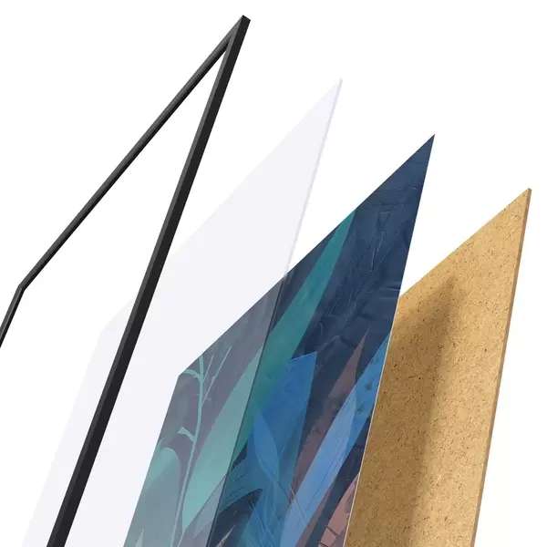 Plagát sa skladá z rámu, plexiskla, vytlačeného obrazu a podkladu z drevotriesky. Plagát možno okamžite zavesiť na stenu vďaka úchytom na zadnej strane.