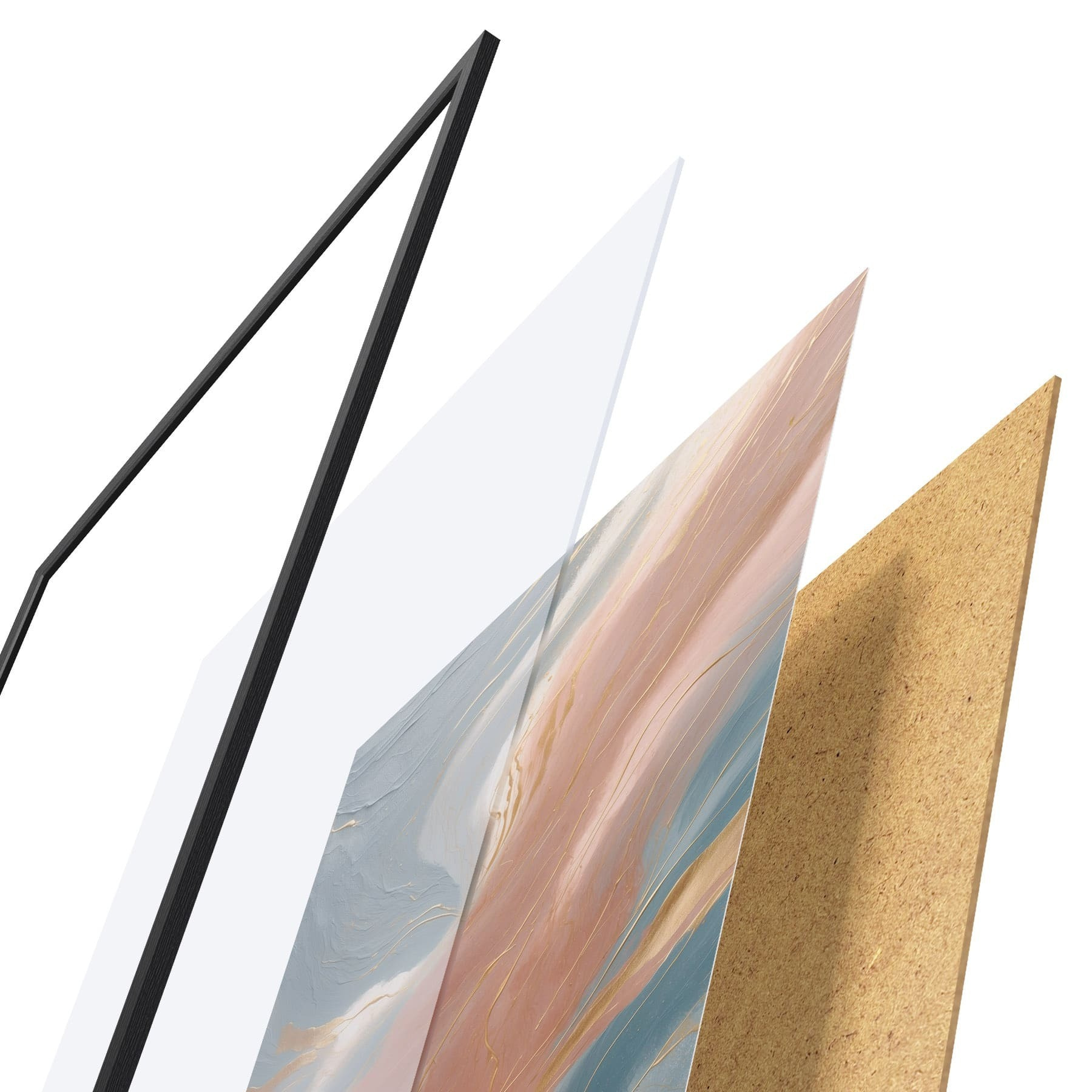 Plagát sa skladá z rámu, plexiskla, vytlačeného obrazu a podkladu z drevotriesky. Plagát možno okamžite zavesiť na stenu vďaka úchytom na zadnej strane.