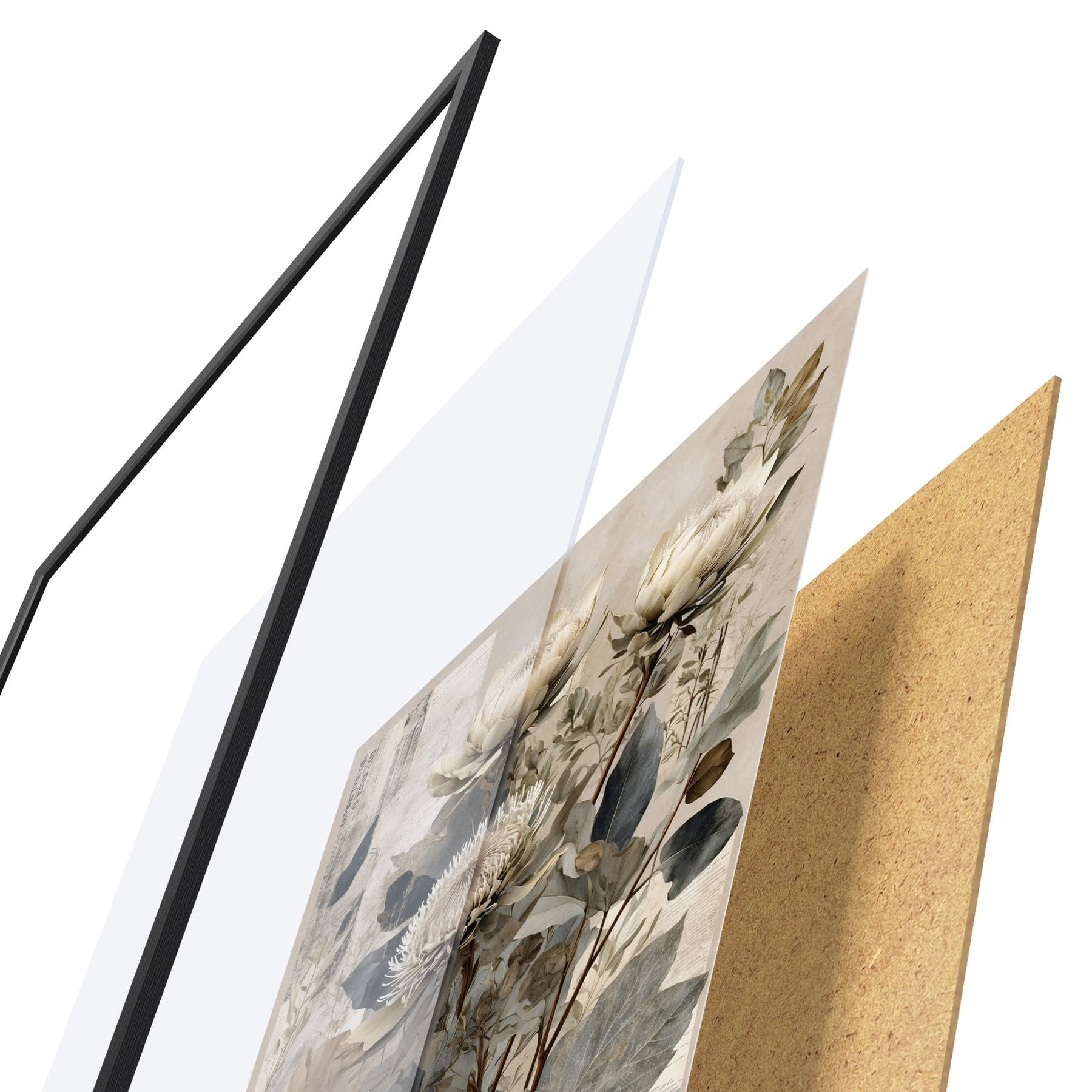Plagát sa skladá z rámu, plexiskla, vytlačeného obrazu a podkladu z drevotriesky. Plagát možno okamžite zavesiť na stenu vďaka úchytom na zadnej strane.