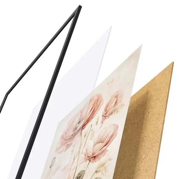 Plagát sa skladá z rámu, plexiskla, vytlačeného obrazu a podkladu z drevotriesky. Plagát možno okamžite zavesiť na stenu vďaka úchytom na zadnej strane.