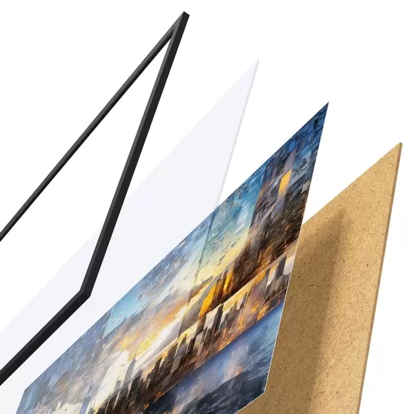 Plagát sa skladá z rámu, plexiskla, vytlačeného obrazu a podkladu z drevotriesky. Plagát možno okamžite zavesiť na stenu vďaka úchytom na zadnej strane.