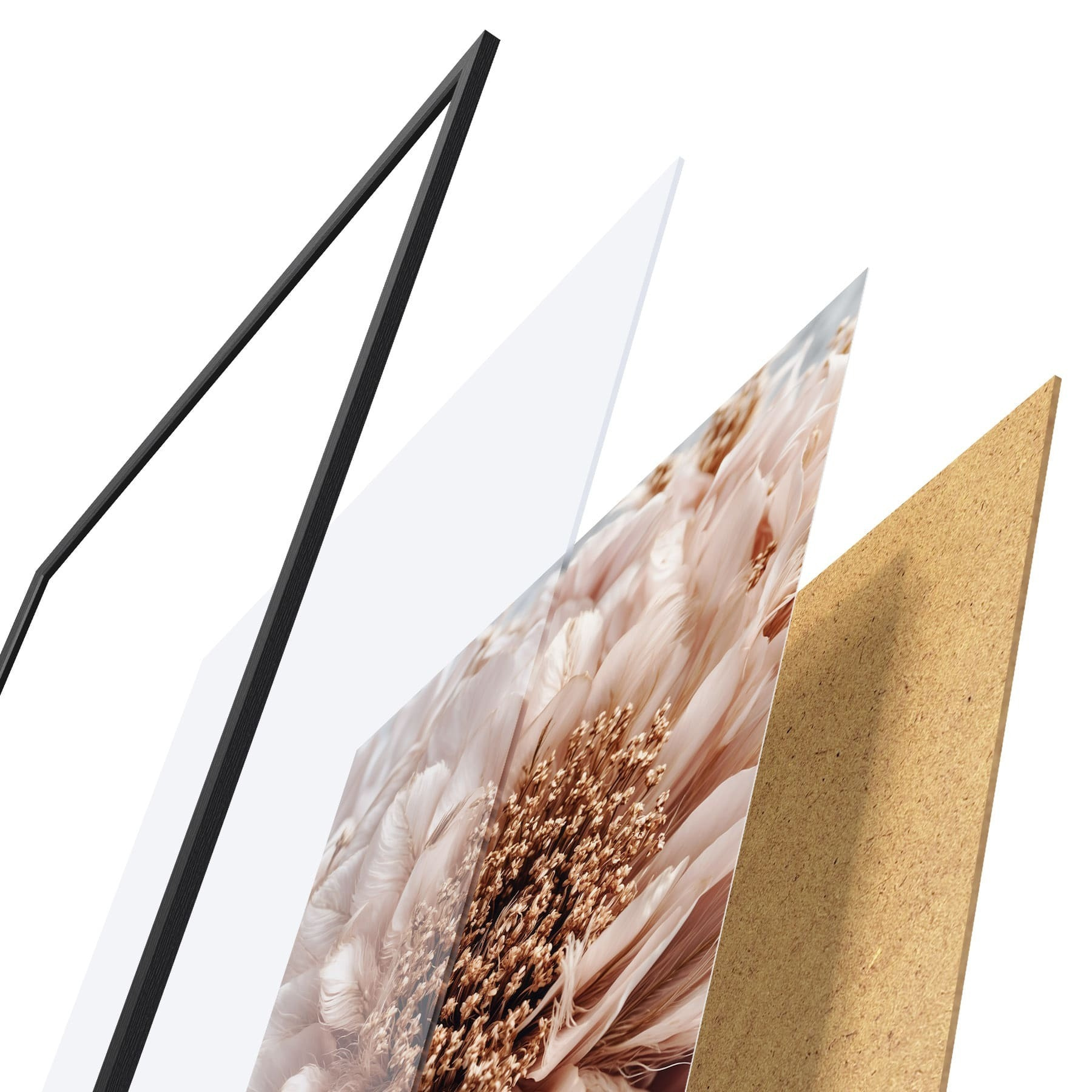 Plagát sa skladá z rámu, plexiskla, vytlačeného obrazu a podkladu z drevotriesky. Plagát možno okamžite zavesiť na stenu vďaka úchytom na zadnej strane.