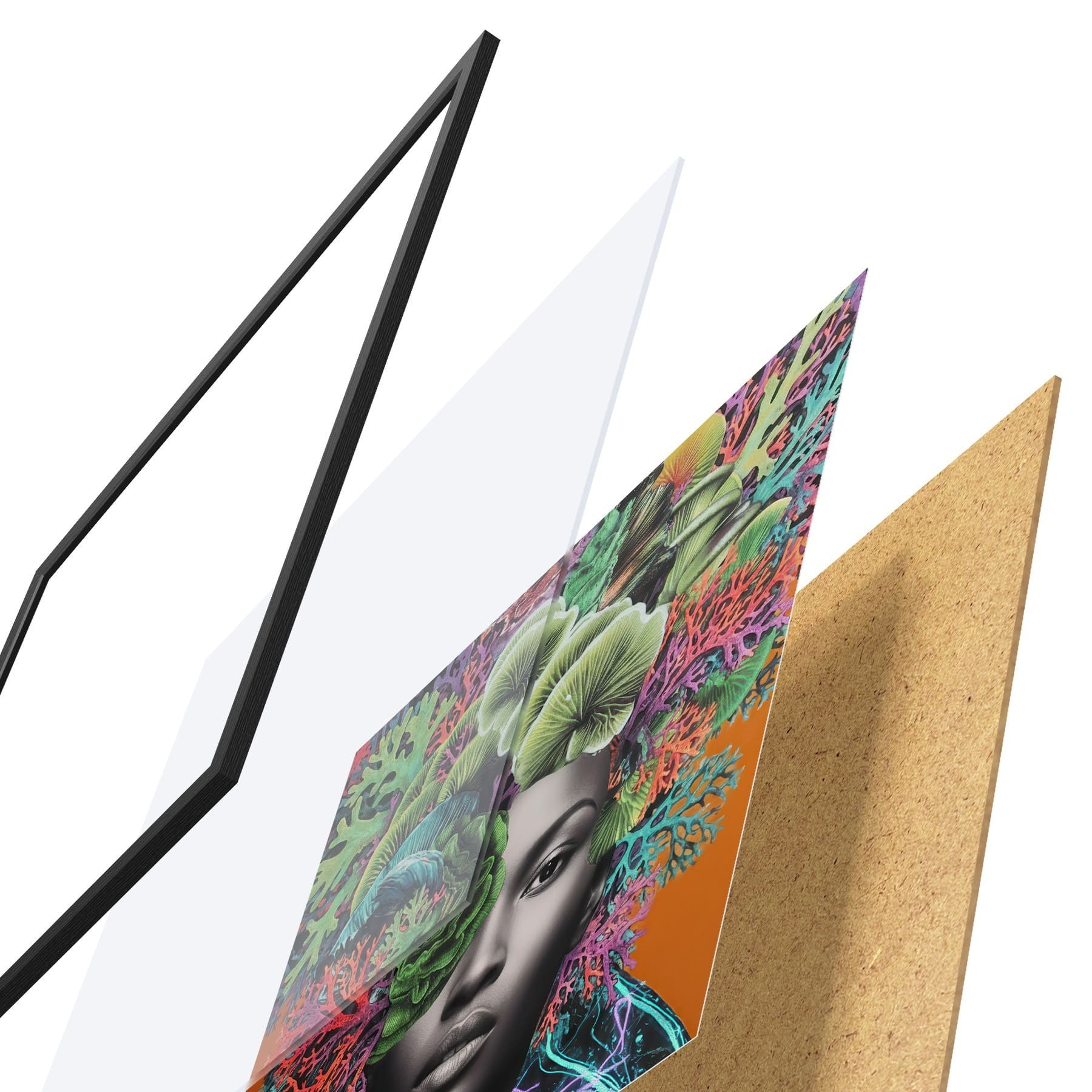 Plagát sa skladá z rámu, plexiskla, vytlačeného obrazu a podkladu z drevotriesky. Plagát možno okamžite zavesiť na stenu vďaka úchytom na zadnej strane.