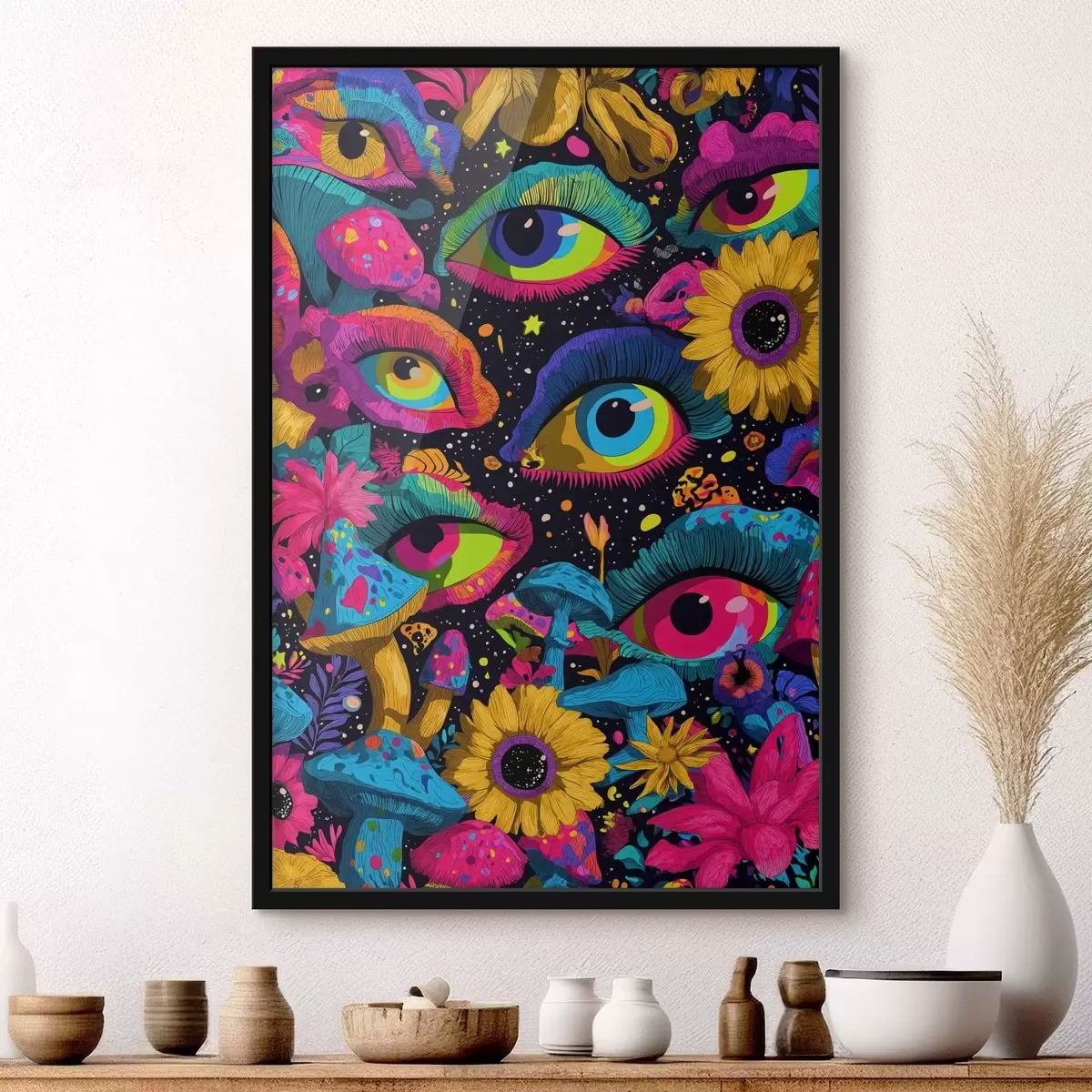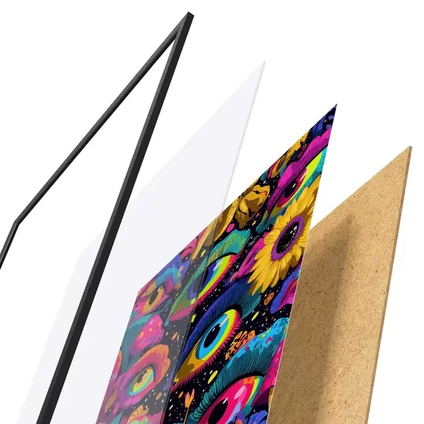 Plagát sa skladá z rámu, plexiskla, vytlačeného obrazu a podkladu z drevotriesky. Plagát možno okamžite zavesiť na stenu vďaka úchytom na zadnej strane.