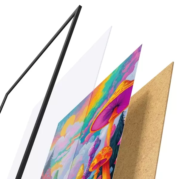 Plagát sa skladá z rámu, plexiskla, vytlačeného obrazu a podkladu z drevotriesky. Plagát možno okamžite zavesiť na stenu vďaka úchytom na zadnej strane.