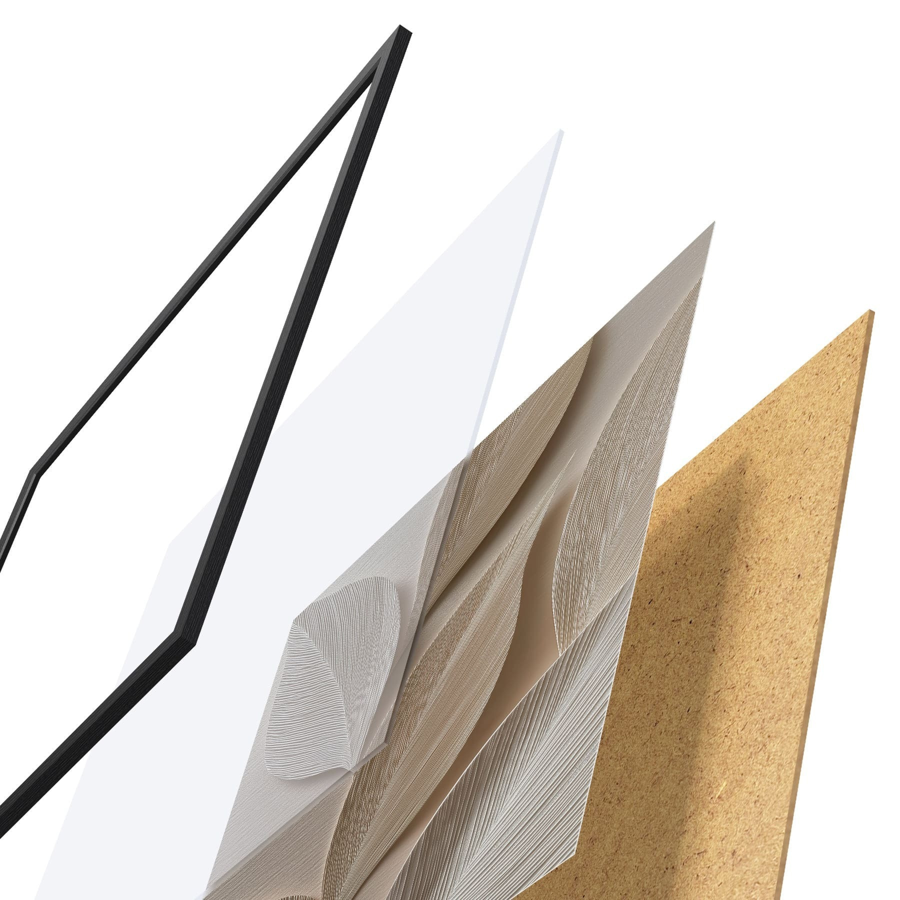 Plagát sa skladá z rámu, plexiskla, vytlačeného obrazu a podkladu z drevotriesky. Plagát možno okamžite zavesiť na stenu vďaka úchytom na zadnej strane.