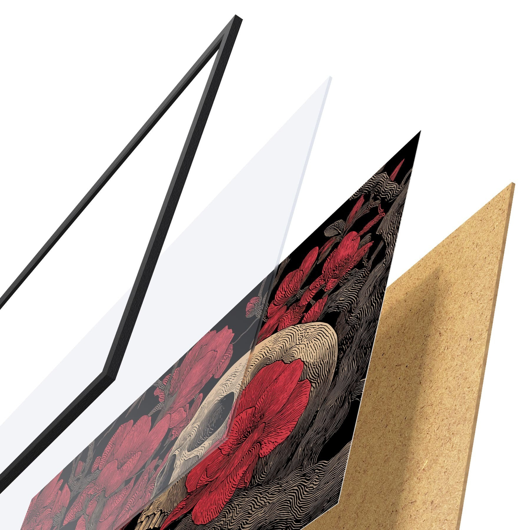 Plagát sa skladá z rámu, plexiskla, vytlačeného obrazu a podkladu z drevotriesky. Plagát možno okamžite zavesiť na stenu vďaka úchytom na zadnej strane.