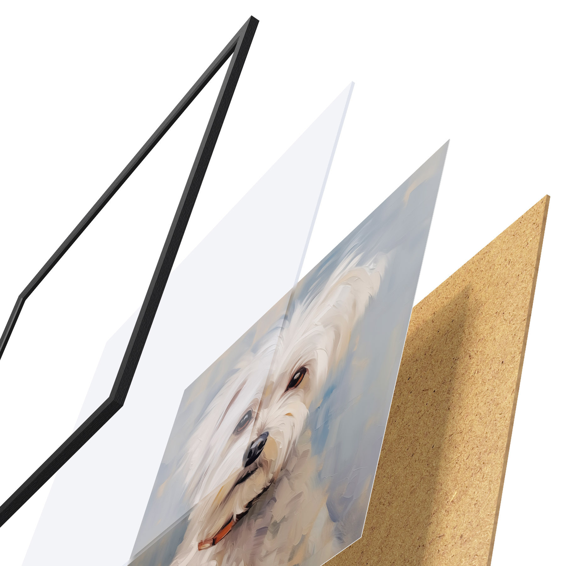 Plagát sa skladá z rámu, plexiskla, vytlačeného obrazu a podkladu z drevotriesky. Plagát možno okamžite zavesiť na stenu vďaka úchytom na zadnej strane.