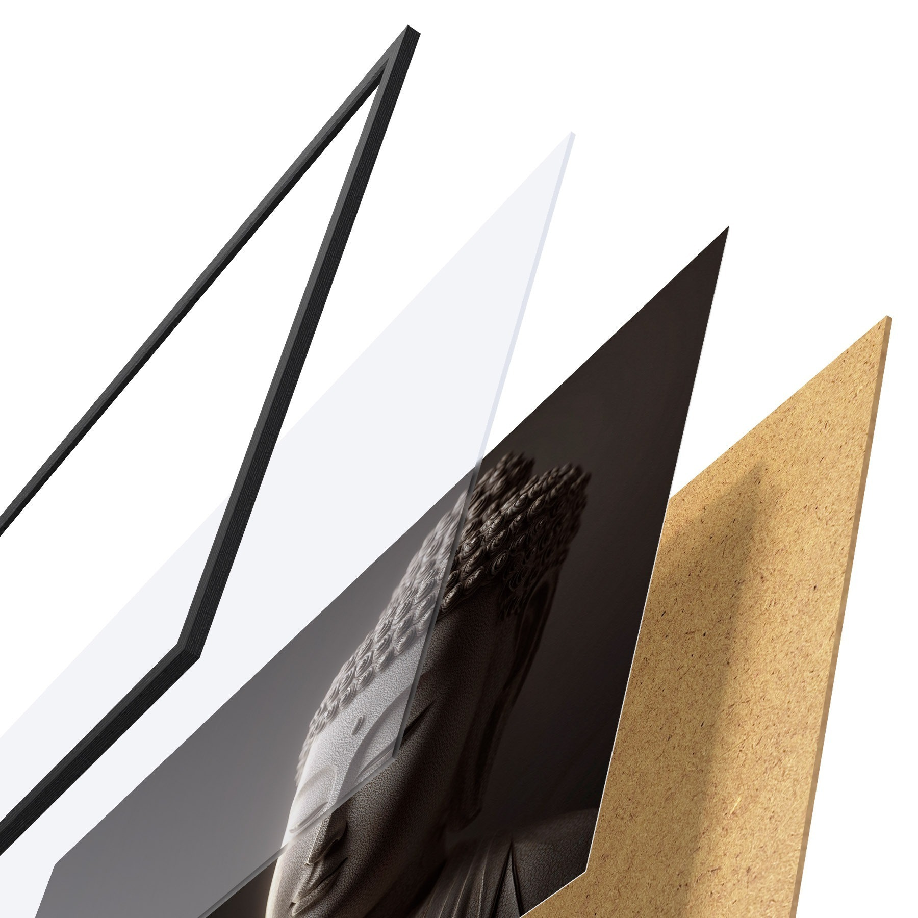 Plagát sa skladá z rámu, plexiskla, vytlačeného obrazu a podkladu z drevotriesky. Plagát možno okamžite zavesiť na stenu vďaka úchytom na zadnej strane.