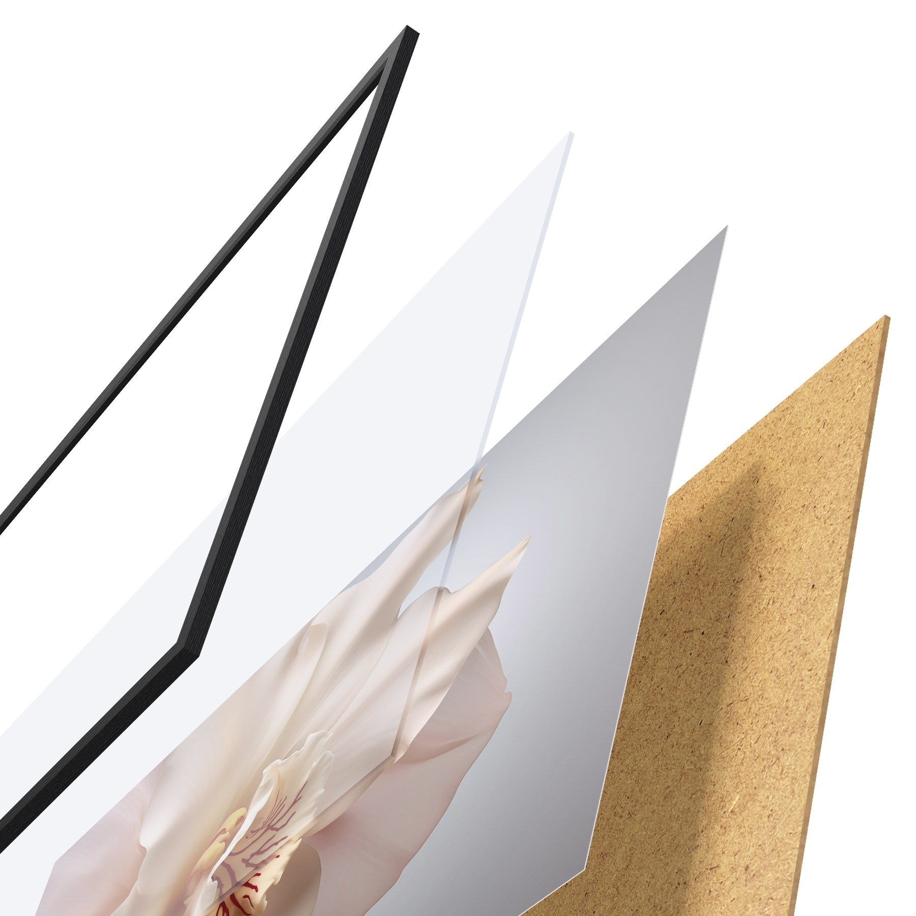 Plagát sa skladá z rámu, plexiskla, vytlačeného obrazu a podkladu z drevotriesky. Plagát možno okamžite zavesiť na stenu vďaka úchytom na zadnej strane.