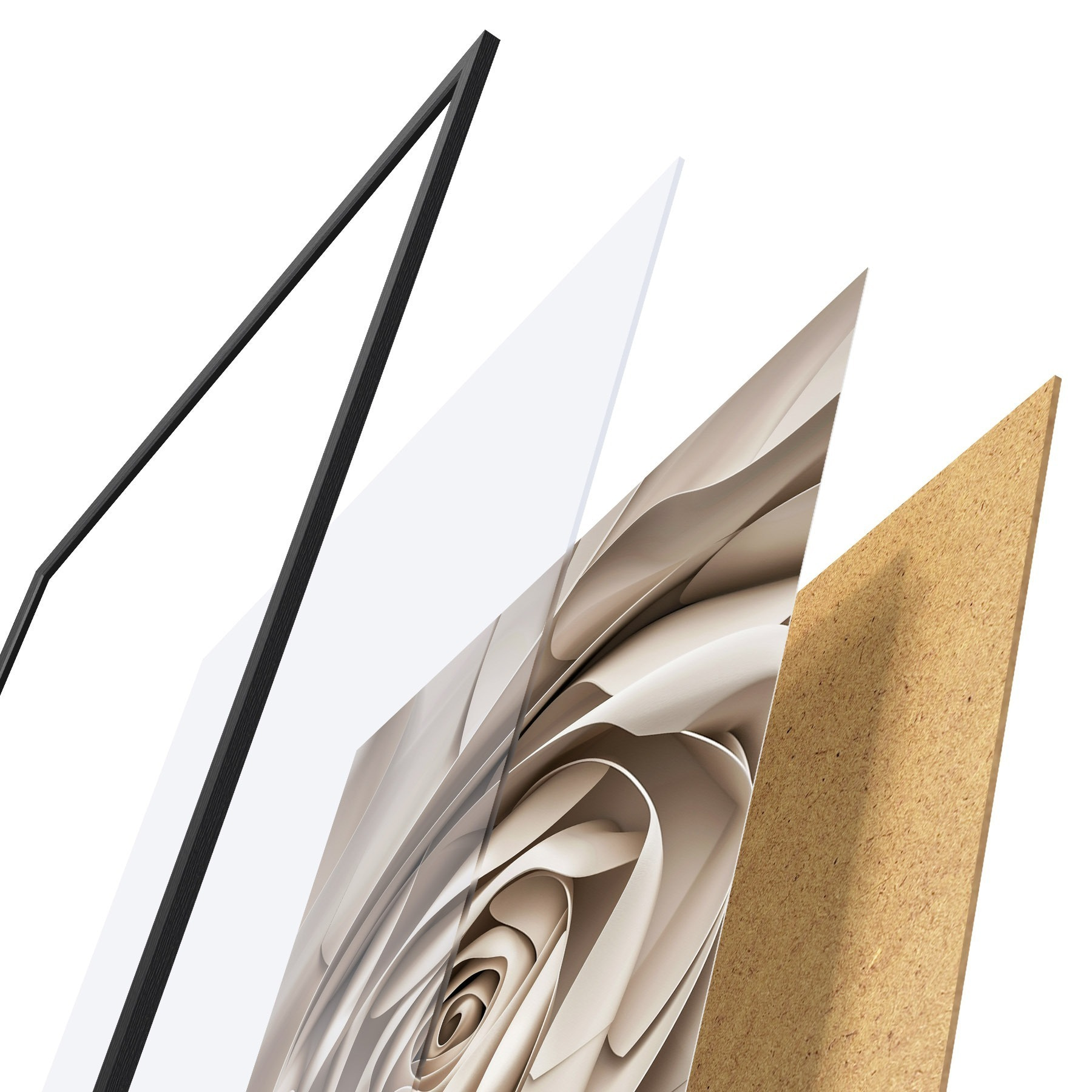 Plagát sa skladá z rámu, plexiskla, vytlačeného obrazu a podkladu z drevotriesky. Plagát možno okamžite zavesiť na stenu vďaka úchytom na zadnej strane.